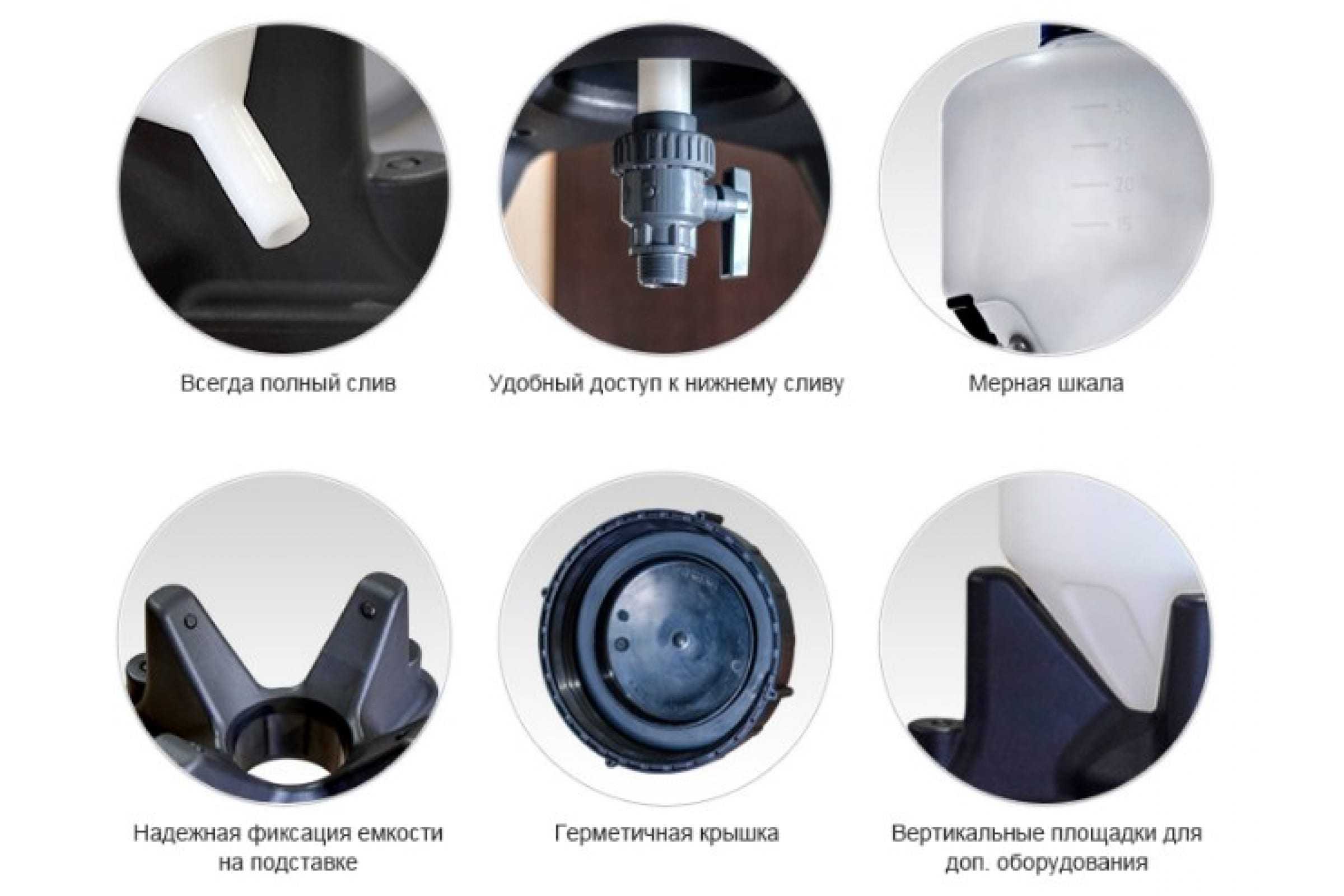 Включает в себя емкость 35 литров конической формы, подставку, гидрозатвор и шаровой кран для обеспечения удобного слива.
