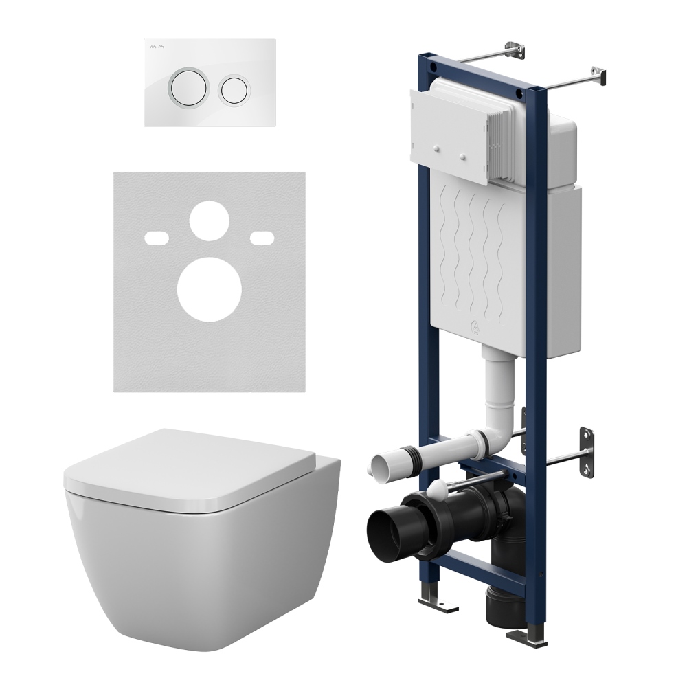 Состав поставки: система инсталляции, унитаз подвесной, крышка-сиденье, кнопка смыва, комплект шумоизоляции, монтажный комплект.