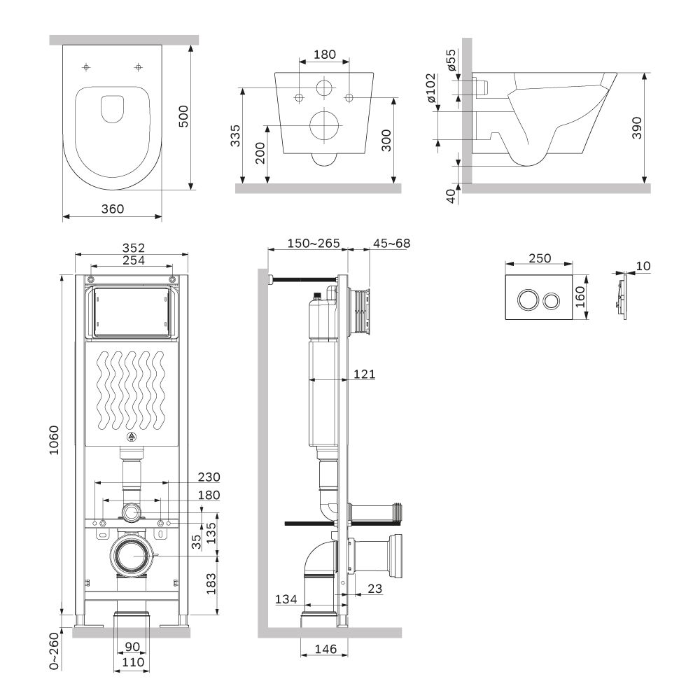 Рама выдерживает нагрузку до 500 кг. Внутреннее сечение профиля 3 мм обеспечивает надежность и долговечность конструкции. Подходит для унитазов любых размеров. Высокая прочность и износостойкость. Подключение воды сзади сверху. В комплекте механическая двухрежимная клавиша из ABS пластика в цвете матовый черный.