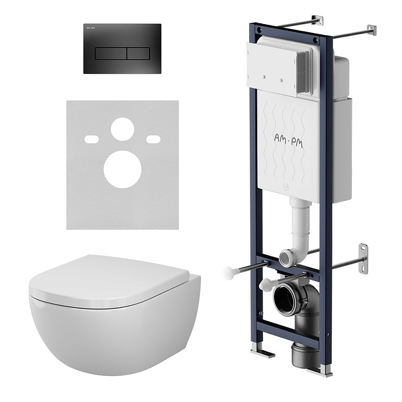 Готовый комплект к установке: система инсталляции для подвесного унитаза AM.PM Above IS110338.9X1900 с механической черной клавишей, подвесной унитаз AM.PM Above C9X1900SC.