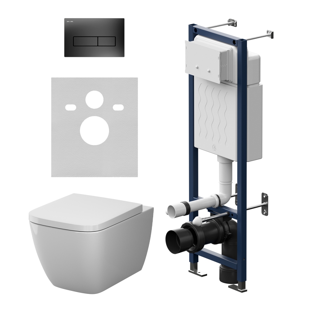 Состав поставки: система инсталляции, унитаз подвесной, крышка-сиденье, кнопка смыва, комплект шумоизоляции, монтажный комплект.