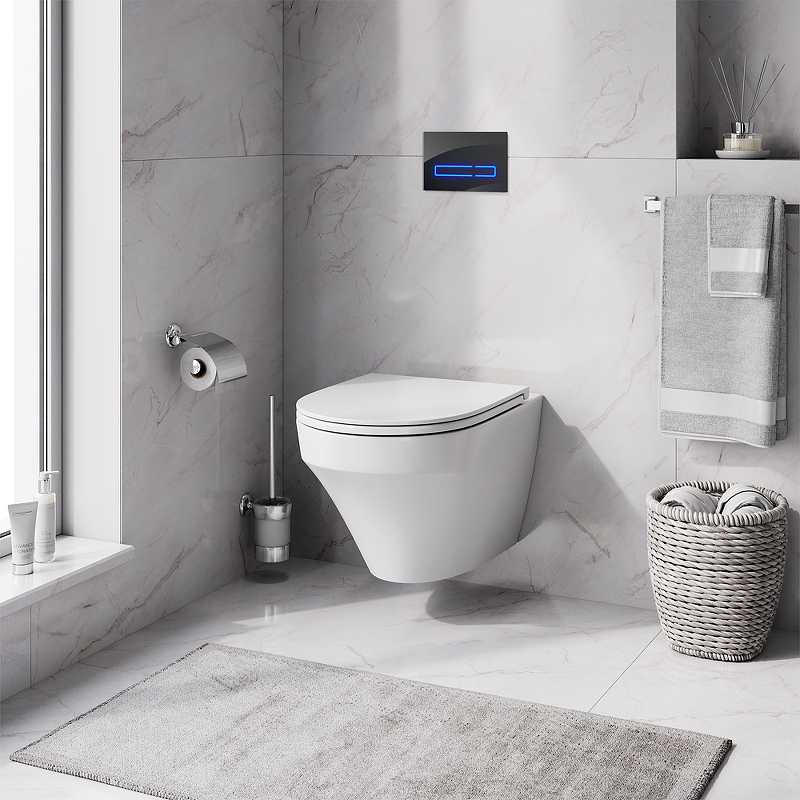 Полностью готовый к установке комплект: система инсталляции с клавишей, подвесной унитаз сиденьем. Неразборная рама из стального профиля выдерживает нагрузку до 400 кг. Полностью изолированный бачок с качественной двухрежимной смывной арматурой - комфортное использование благодаря низкмоу уровню шума - менее 20 Дб. Укомплектован сенсорной клавишей в черном цвете. В комплекте все необходимые патрубки и крепления, а также прокладка между унитазом и стеной - звукоизоляция.