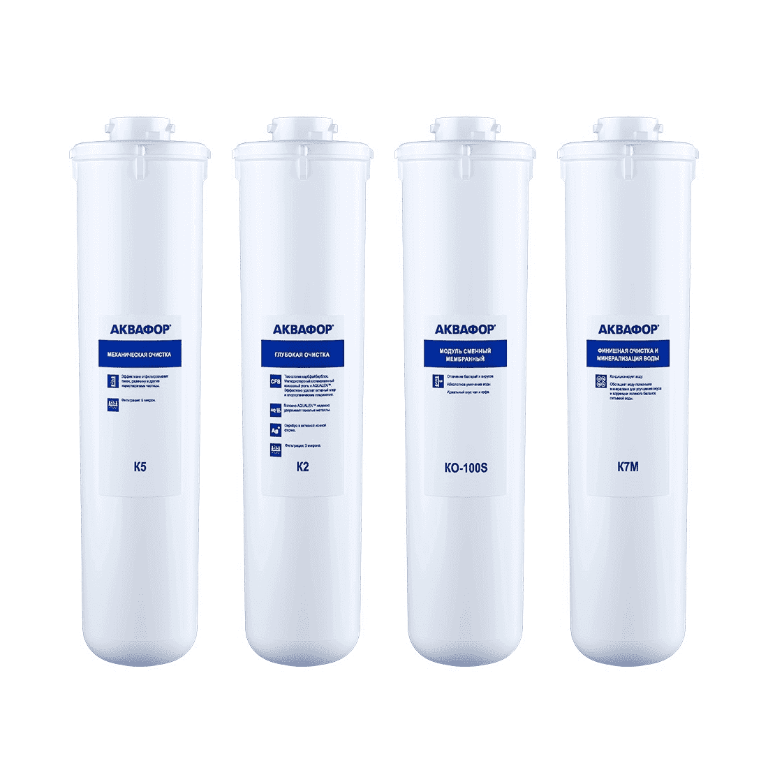 Функции модулей в наборе: К5 - предварительная сорбционная очистка питьевой воды (задерживает частицы размером 5 мкм), К2 - глубокая сорбционная доочистка питьевой воды (задерживает частицы размером 3 мкм, ресурс модуля 4000 л, скорость фильтрации: 1,5 л/мин), KO-100S - сверхглубокая очистка и умягчение воды, К7М - финишная сорбционная очистка и кондиционирование питьевой воды (задерживает частицы размером 0,8 мкм), обеспечивает оптимальную минерализацию.