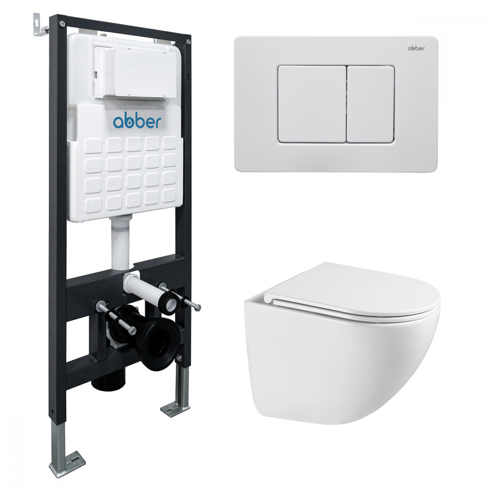 Комплект подвесной унитаз Abber Bequem AC1131TC белый, с закрытым дном с инсталляцией AC0105 и кнопкой AC0120MW белая матовая (AC1131TC-AC0105-AC0120M