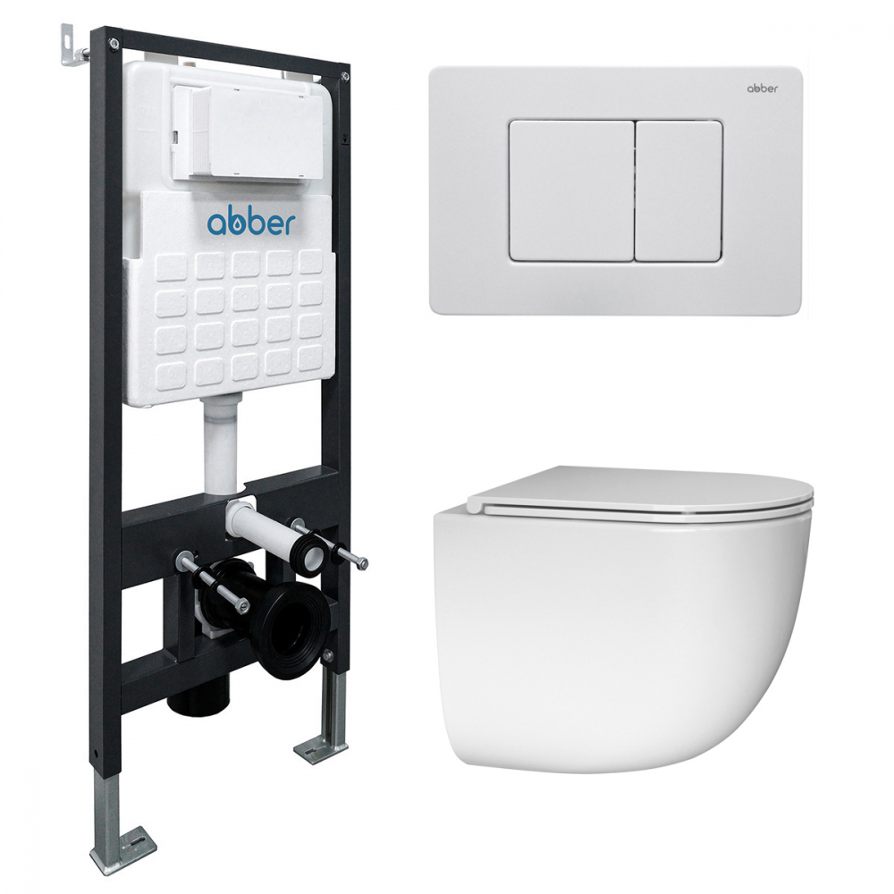 Комплект подвесной унитаз Abber Bequem AC1132TC белый, с закрытым дном с инсталляцией AC0105 и кнопкой AC0120MW белая матовая (AC1132TC-AC0105-AC0120M