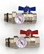 Кран со сгоном 1"" (американкой) полнопроходной с термометром (2 шт. красная и синяя бабочка) для коллекторных групп TeRma (33503) произведен из высококачественной латуни, ручка ""бабочка"" шарового крана изготовлена из алюминия (красная и синяя). Термометр отображает температуру проходящего через кран теплоносителя.