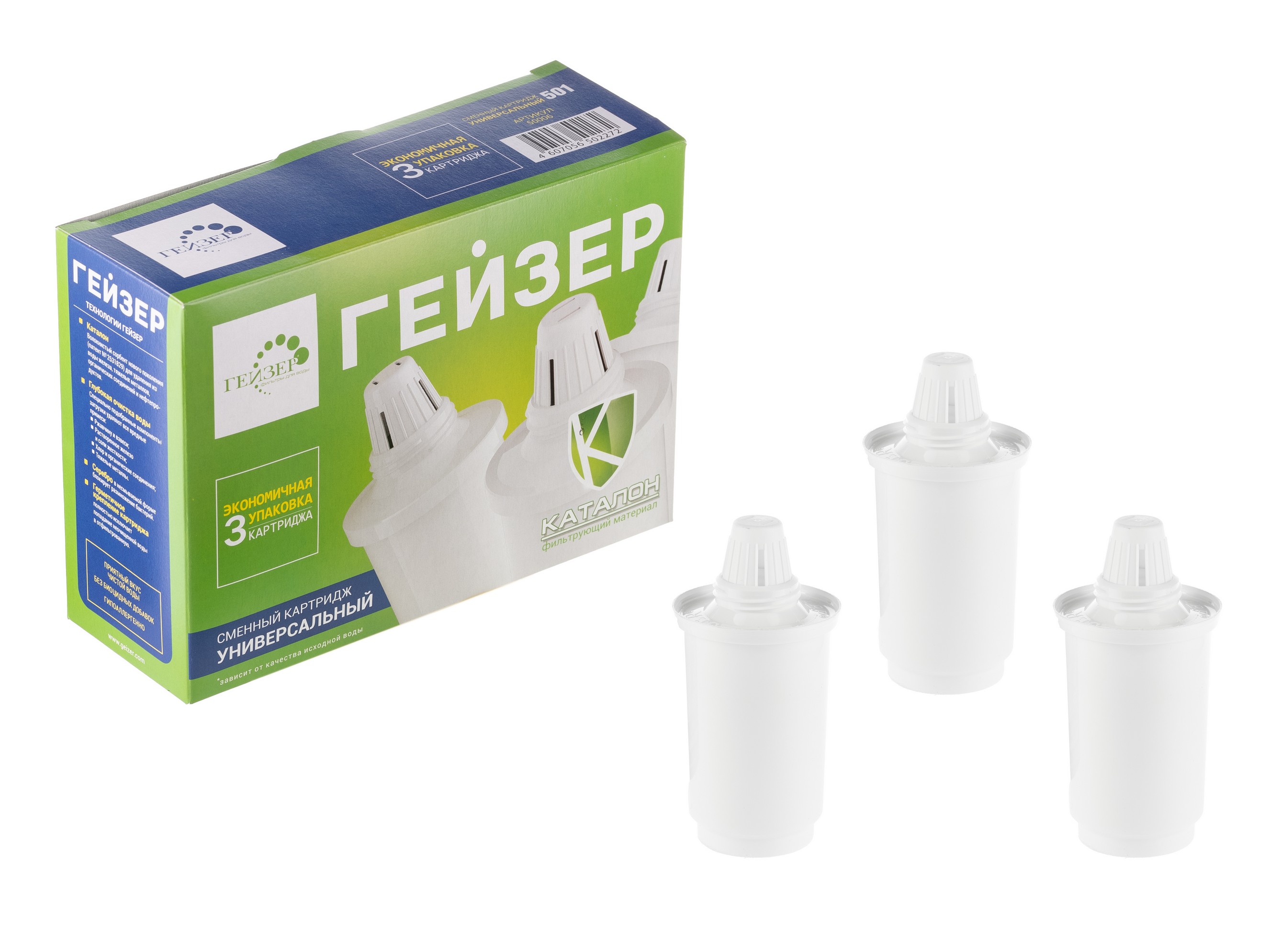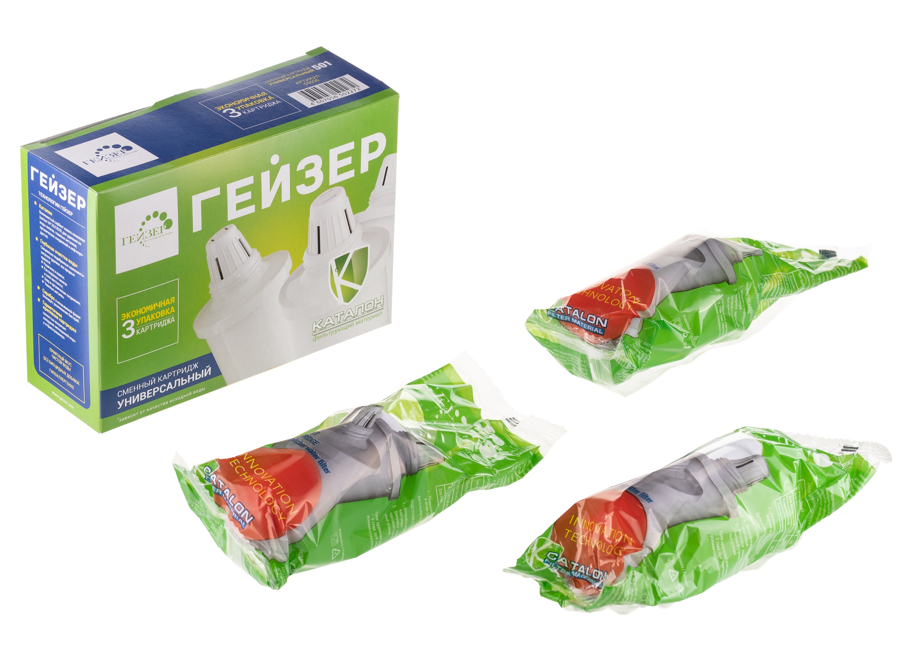 Сменные модули (картриджи) имеют одинаковые присоединительные размеры, взаимозаменяемы и могут устанавливаться в любой фильтр-кувшин Гейзер (а с использованием переходников — в кувшины других производителей). Комплект сменных модулей 501 для мягкой воды, либо комплект сменныхмодулей 502 для жесткой воды.