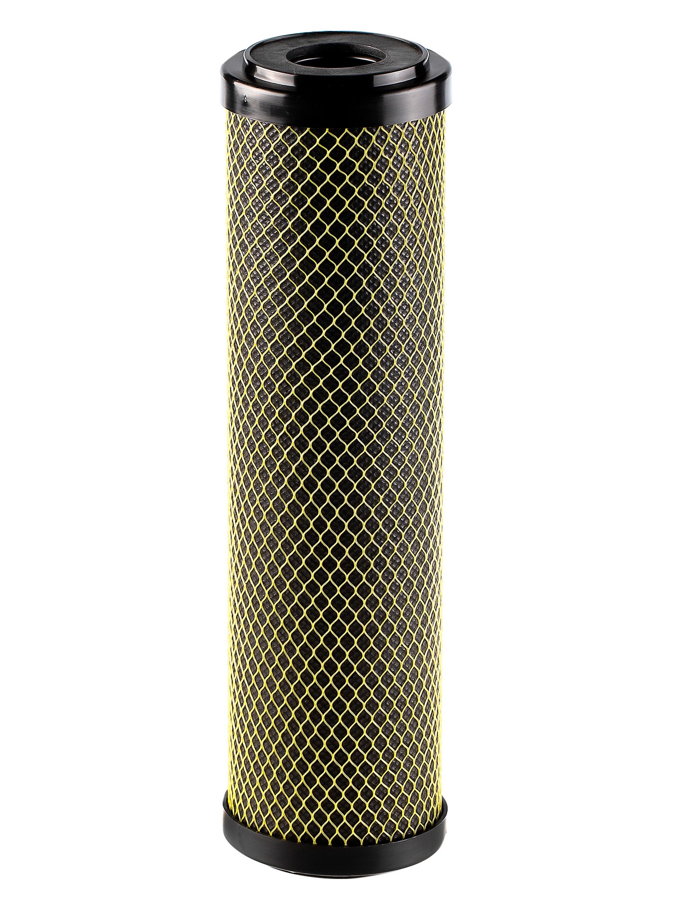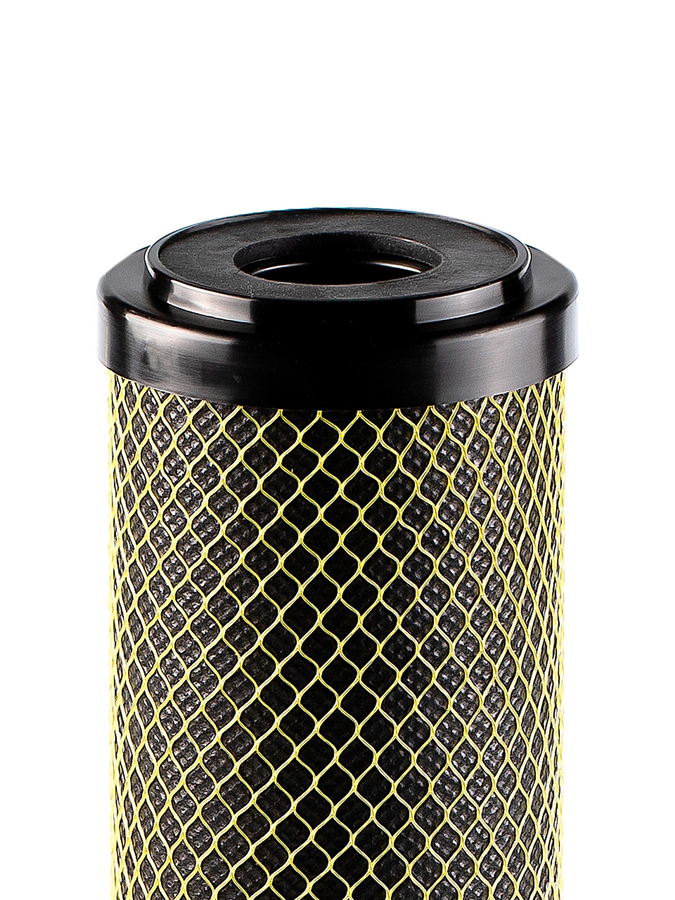 - 3 ступень:Картридж МИКС БЛОК – содержит высококачественный активированный уголь на основе скорлупы кокосового ореха с добавлением ионообменного материала Каталон – эффективно удаляет из воды хлор, железо, органические и хлорорганические соединения, пестициды, нефтепродукты и фенолы. Улучшает органолептические показатели воды. Пористость – 10 мкм. Содержит серебро в несмываемой форме. Ресурс – до 6 мес*.