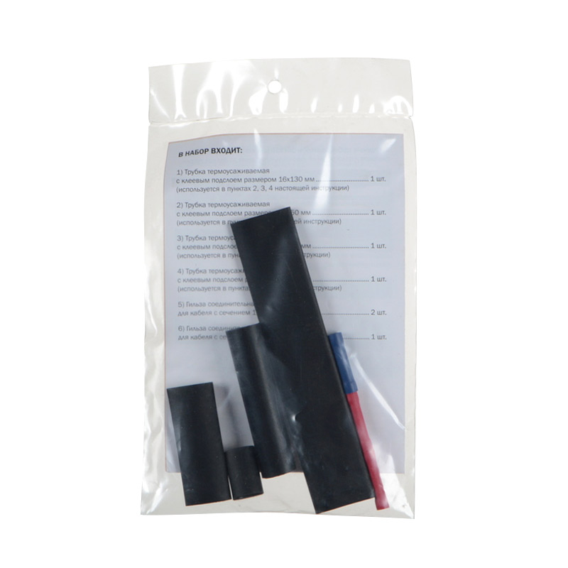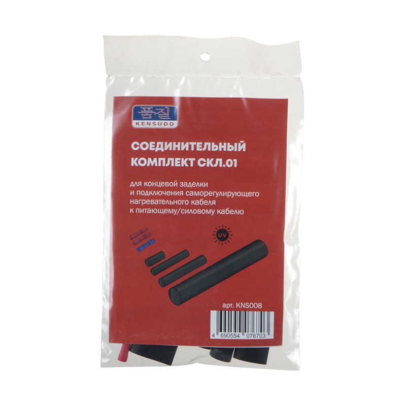 Набор для соединения и герметизации мест подключений греющего кабеля. Герметизация достигается за счёт термоусаживаемой трубки с внутренним клеевым слоем. В комплект входят соединительные гильзы для подключения токоведущих жил и термоусаживаемые трубки с клеевой основой. Используется для греющих кабелей предназначенных для обогрева труб снаружи.
