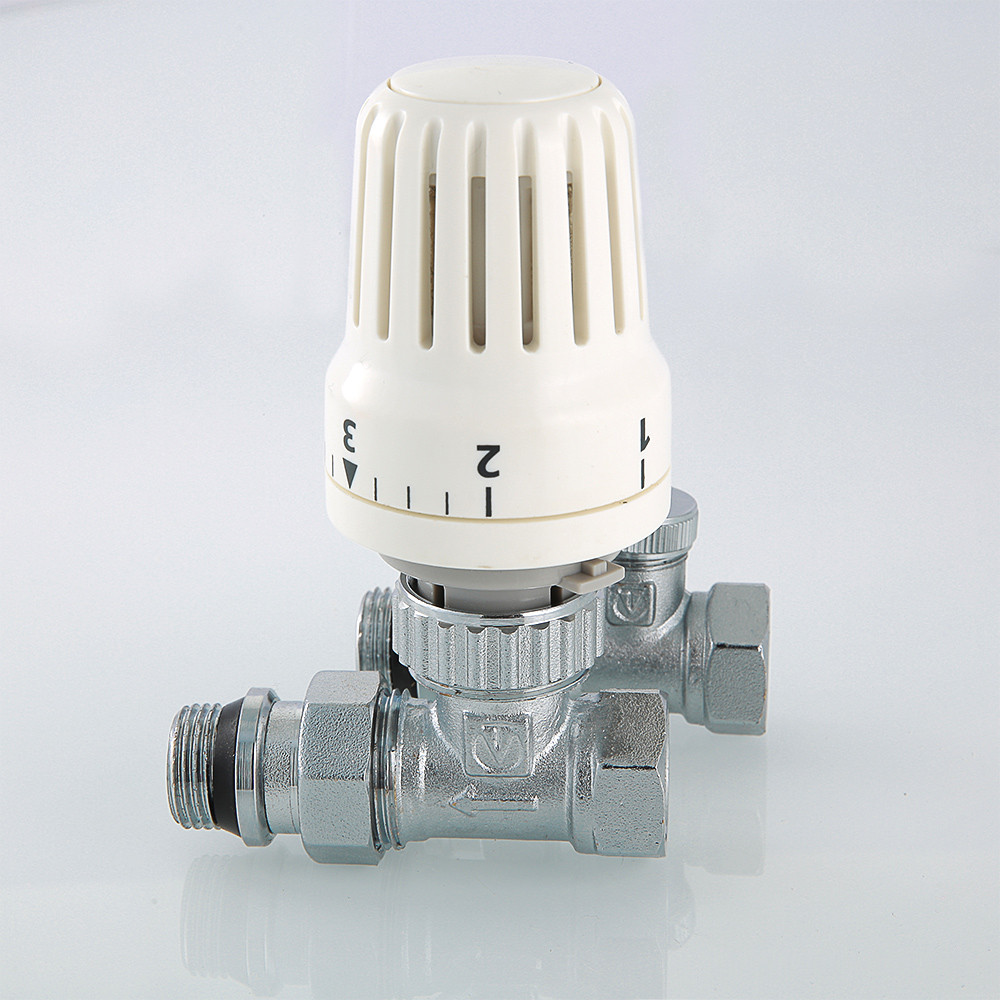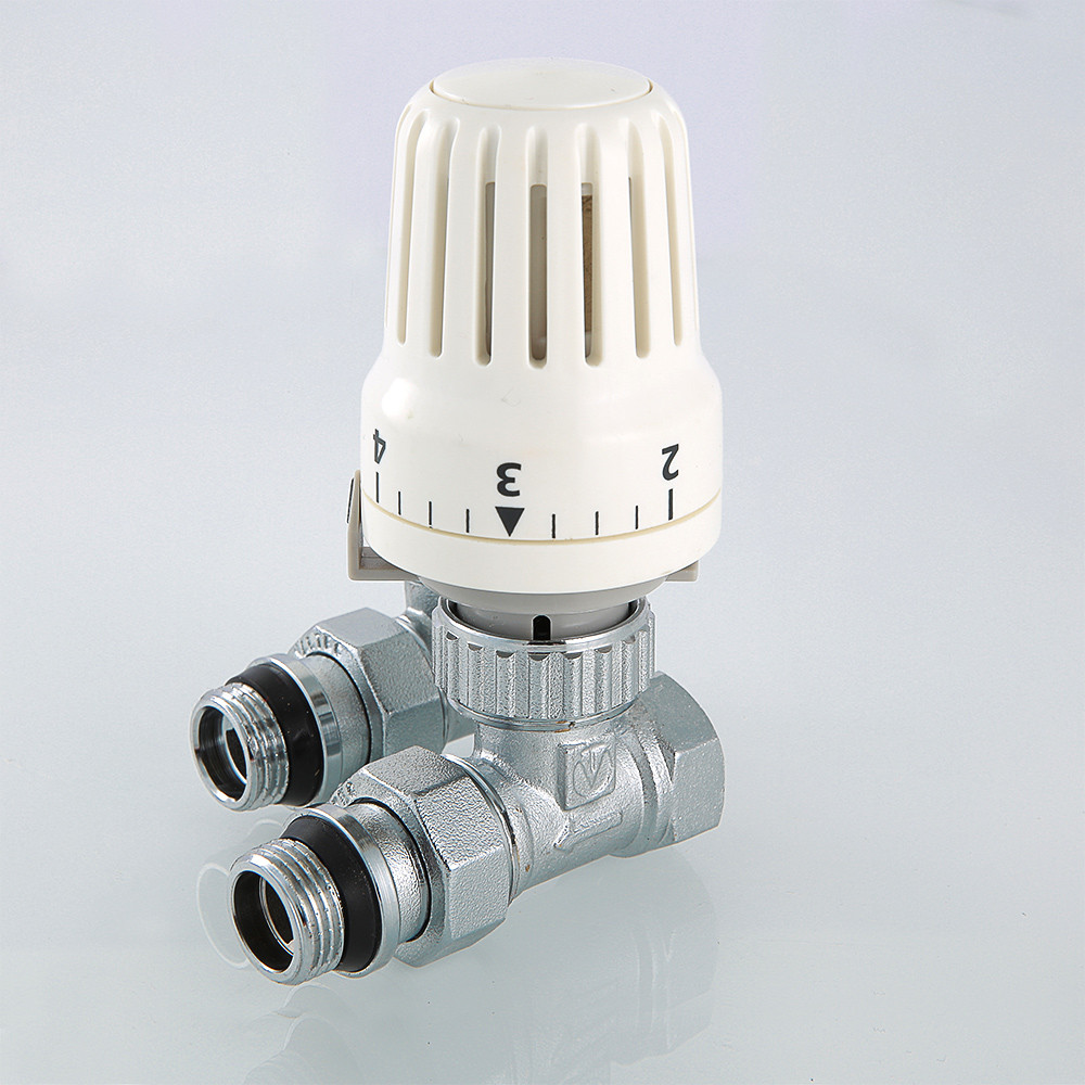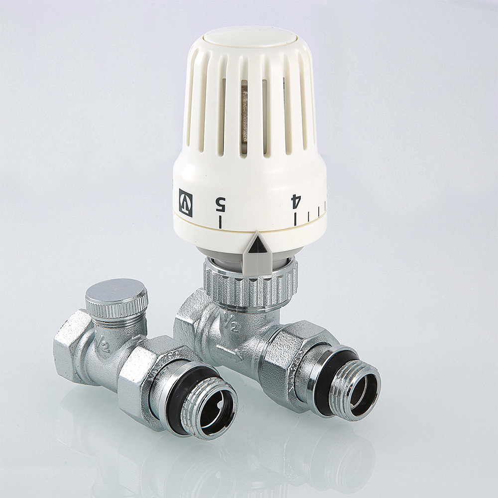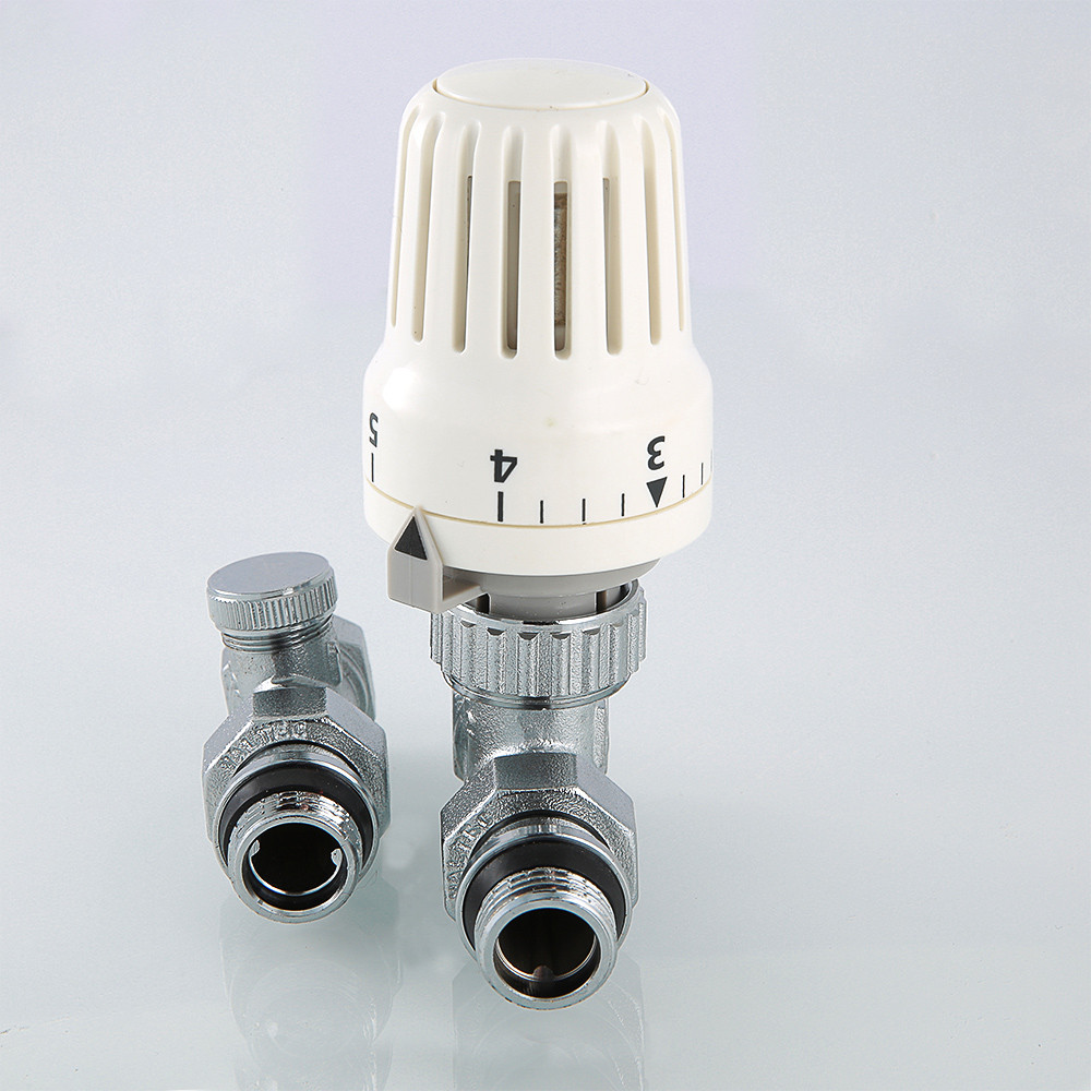 Комплект терморегулирующего оборудования VT.046 включает в себя прямые термостатический и запорно-регулировочный (настроечный) радиаторные клапаны, а также термостатическую головку. Набор предназначен для бокового подключения прибора водяного отопления, автоматического регулирования расхода теплоносителя через него в зависимости от температуры воздуха в помещении, гидравлической балансировки системы отопления. Клапаны выполнены из качественной сантехнической латуни с гальваническим покрытием и оснащены самоуплотняющимися полусгонами. Колпачок ручной регулировки на термостатическом клапане состоит из двух частей – неподвижной нижней и вращающейся верхней. Это позволяет многократно производить монтажную настройку клапана в условиях строительства (до установки термостатической головки), не переживая за целостность резьбы на пластиковом колпачке. Комплект помещен в пылевлагозащитную упаковку (блистер). Стоимость данного комплекта меньше, чем при раздельной покупке входящих в него элементов.
