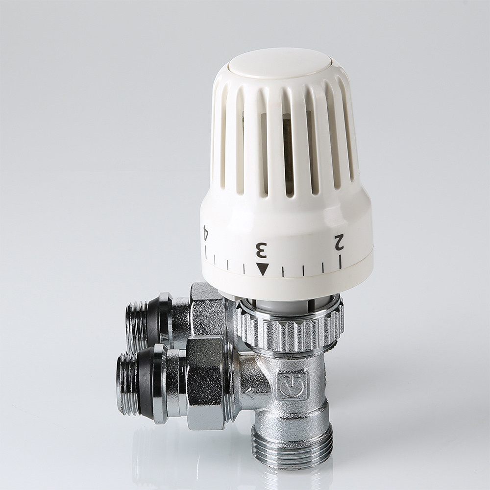 Комплект терморегулирующего оборудования VT.045.NER включает в себя угловые термостатический и запорно-регулировочный (настроечный) радиаторные клапаны и термостатическую головку. Набор предназначен для бокового подключения прибора водяного отопления, автоматического регулирования расхода теплоносителя через него в зависимости от температуры воздуха в помещении, гидравлической балансировки системы отопления. Клапаны выполнены из качественной сантехнической латуни с гальваническим покрытием и оснащены самоуплотняющимися полусгонами. Колпачок ручной регулировки на термостатическом клапане состоит из двух частей – неподвижной нижней и вращающейся верхней. Это позволяет многократно производить монтажную настройку клапана в условиях строительства (до установки термостатической головки), не переживая за целостность резьбы на пластиковом колпачке. Комплект помещен в пылевлагозащитную упаковку (блистер). Стоимость данного комплекта меньше, чем при раздельной покупке входящих в него элементов.