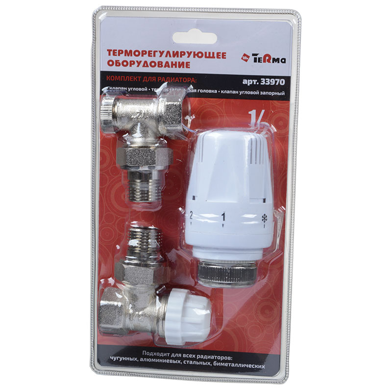 Комплект термостатический для радиатора с угловыми кранами на 1/2"" Terma 33970. В комплект входит угловой запорный клапан, угловой термостатический клапан и термостатическая головка. Клапан и термостатическая головка предназначены для автоматического поддержания заданной температуры в отапливаемом помещении, которая устанавливается с помощью поворота термостатической головки по часовой или против часовой стрелки в соответствии со шкалой настройки на корпусе термостатической головки. Запорный клапан применяется для отключения радиатора от системы отопления, а также для балансировки потока теплоносителя, проходящего через радиатор.