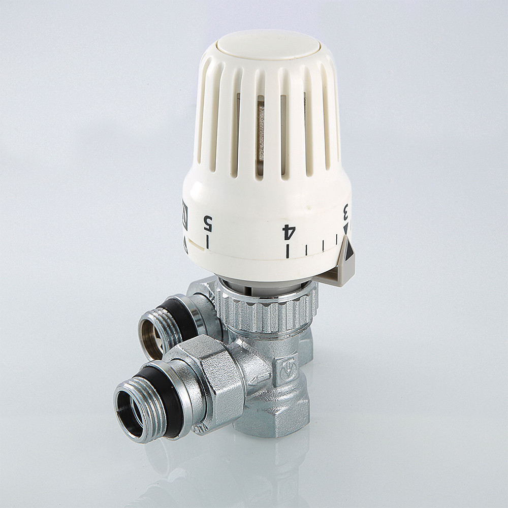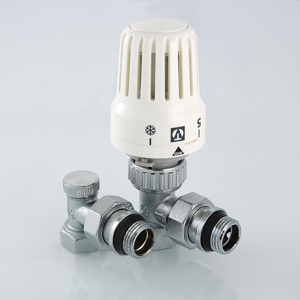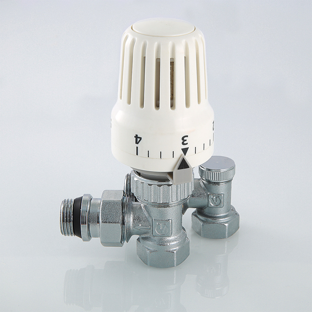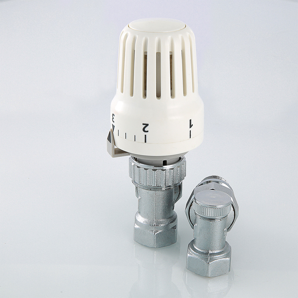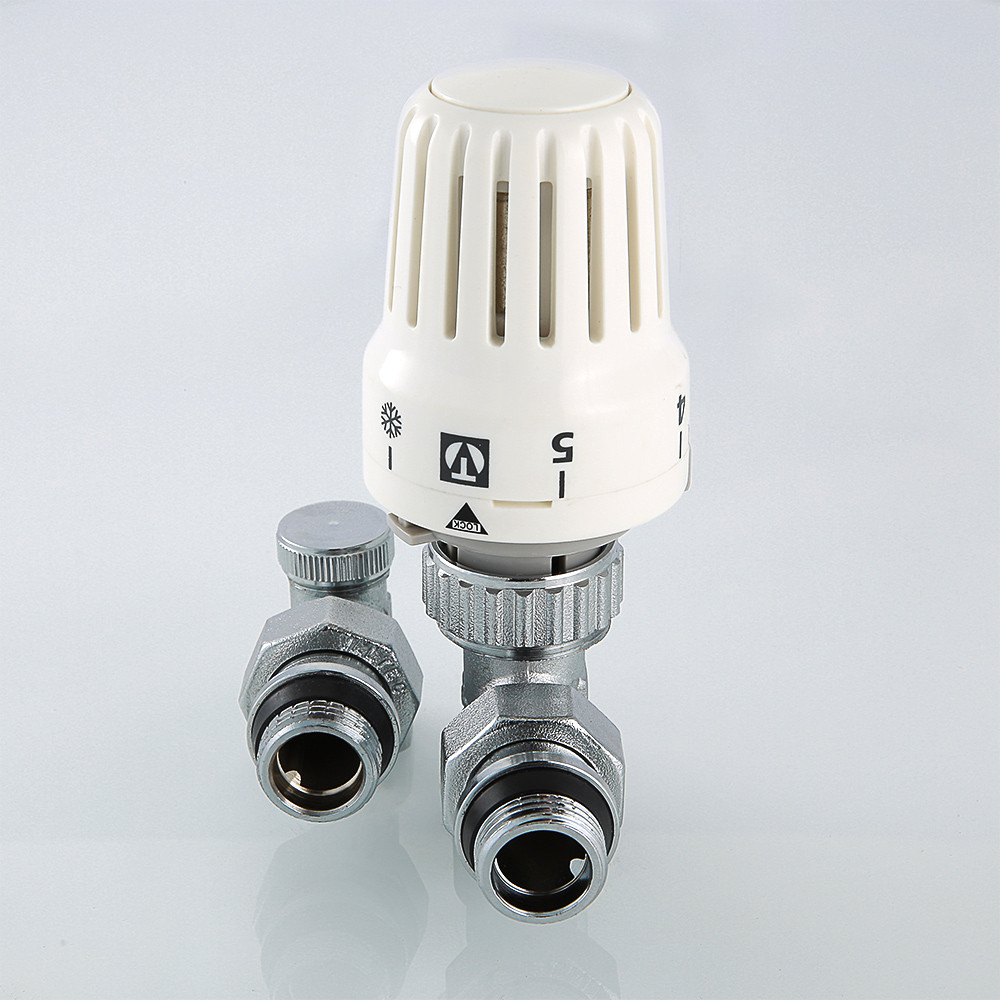 Комплект терморегулирующего оборудования VT.045 включает в себя угловые термостатический и запорно-регулировочный (настроечный) радиаторные клапаны и термостатическую головку. Набор предназначен для бокового подключения прибора водяного отопления, автоматического регулирования расхода теплоносителя через него в зависимости от температуры воздуха в помещении, гидравлической балансировки системы отопления. Клапаны выполнены из качественной сантехнической латуни с гальваническим покрытием и оснащены самоуплотняющимися полусгонами. Колпачок ручной регулировки на термостатическом клапане состоит из двух частей – неподвижной нижней и вращающейся верхней. Это позволяет многократно производить монтажную настройку клапана в условиях строительства (до установки термостатической головки), не переживая за целостность резьбы на пластиковом колпачке. Комплект помещен в пылевлагозащитную упаковку (блистер). Стоимость данного комплекта меньше, чем при раздельной покупке входящих в него элементов.