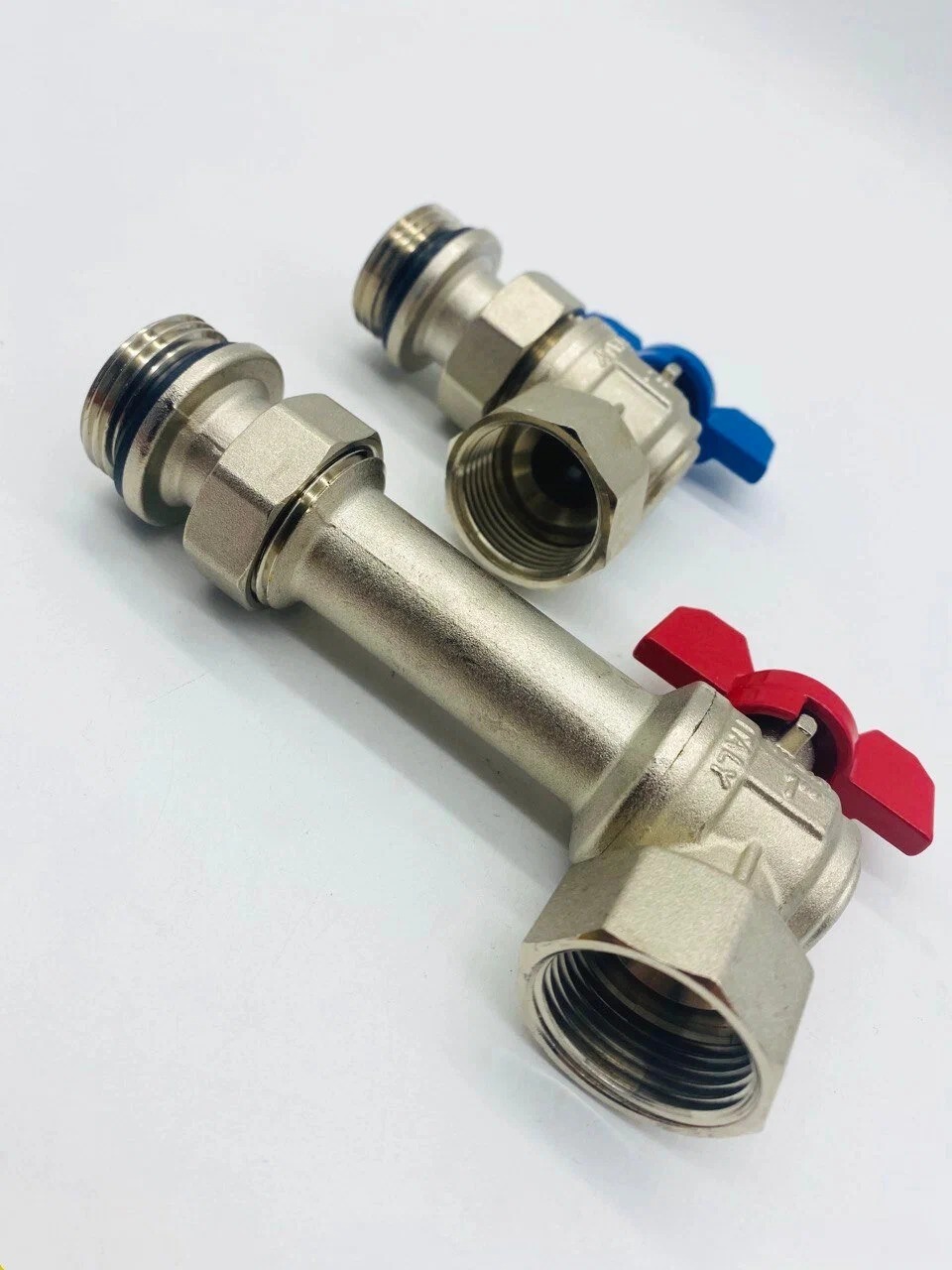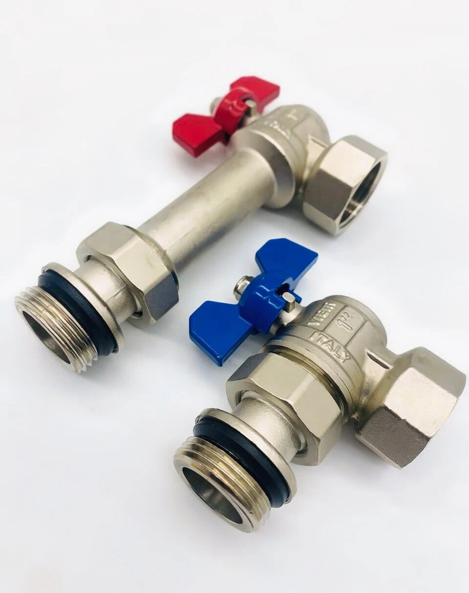 Угловой шаровой кран с полусгоном (пара) предназначен для подключения к коллектору отопления, имеет резиновое уплотнение O-RING для облегчения монтажа крана на коллектор. Может применятся в любых системах отопления и водоснабжения. Продается комплектом (два крана) с красной и синей ручкой-бабочкой для разделения горячего и холодного потока (подачи и обратки).