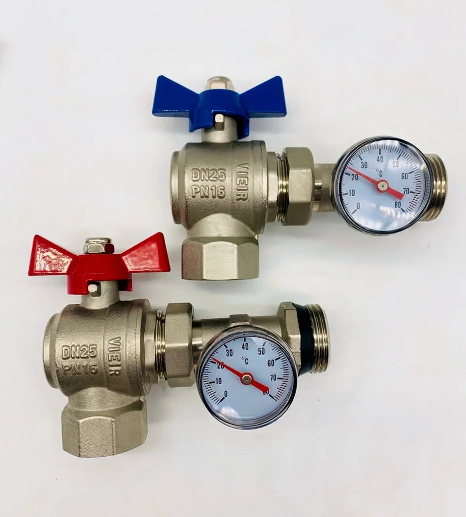 Комплект угловых шаровых кранов со сгонами и термометрами 1" Vieir (синяя+красная бабочки) (VR1105)
