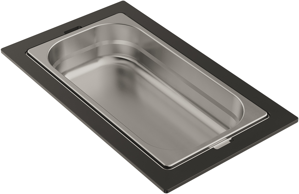 • Чаши свободно вынимаются из пластиковой подставки и перемещаются, а конструкция подставки разработана таким образом, чтобы ее можно было удобно разместить на внутренних ступенчатых направляющих моек: Sintesi 57 и Sintesi 79.