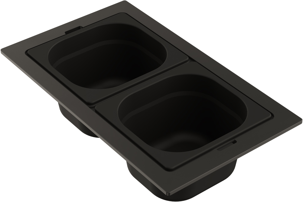 • Чаши свободно вынимаются из пластиковой подставки и перемещаются, а конструкция подставки разработана таким образом, чтобы ее можно было удобно разместить на внутренних ступенчатых направляющих моек: Sintesi 57 и Sintesi 79.