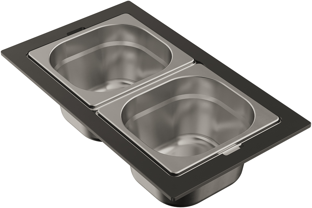 • Чаши свободно вынимаются из пластиковой подставки и перемещаются, а конструкция подставки разработана таким образом, чтобы ее можно было удобно разместить на внутренних ступенчатых направляющих моек: Sintesi 57 и Sintesi 79.