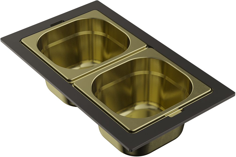 • Чаши свободно вынимаются из пластиковой подставки и перемещаются, а конструкция подставки разработана таким образом, чтобы ее можно было удобно разместить на внутренних ступенчатых направляющих моек: Sintesi 57 и Sintesi 79.