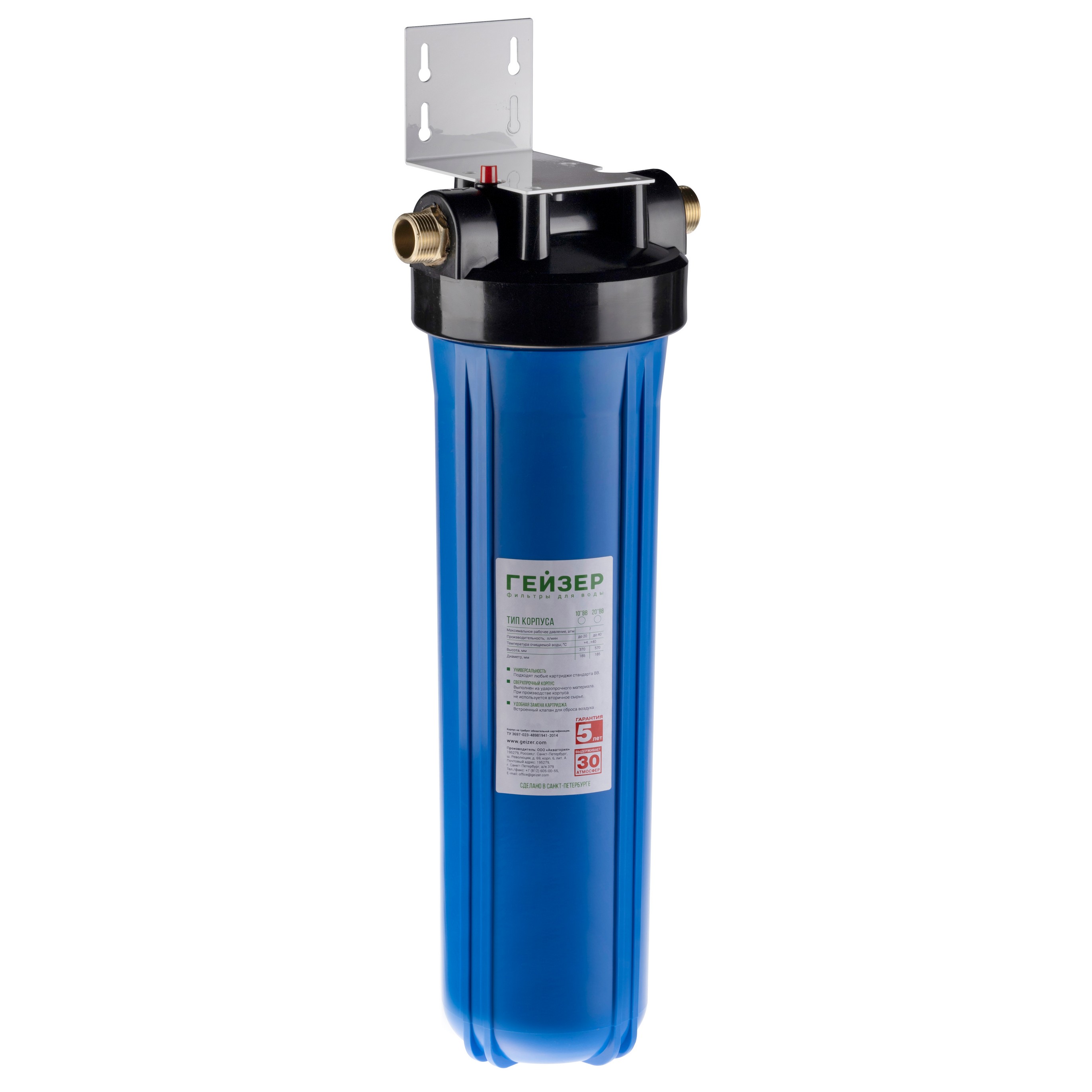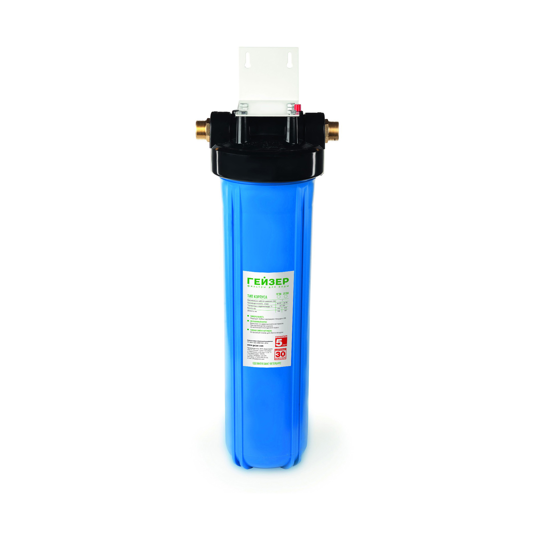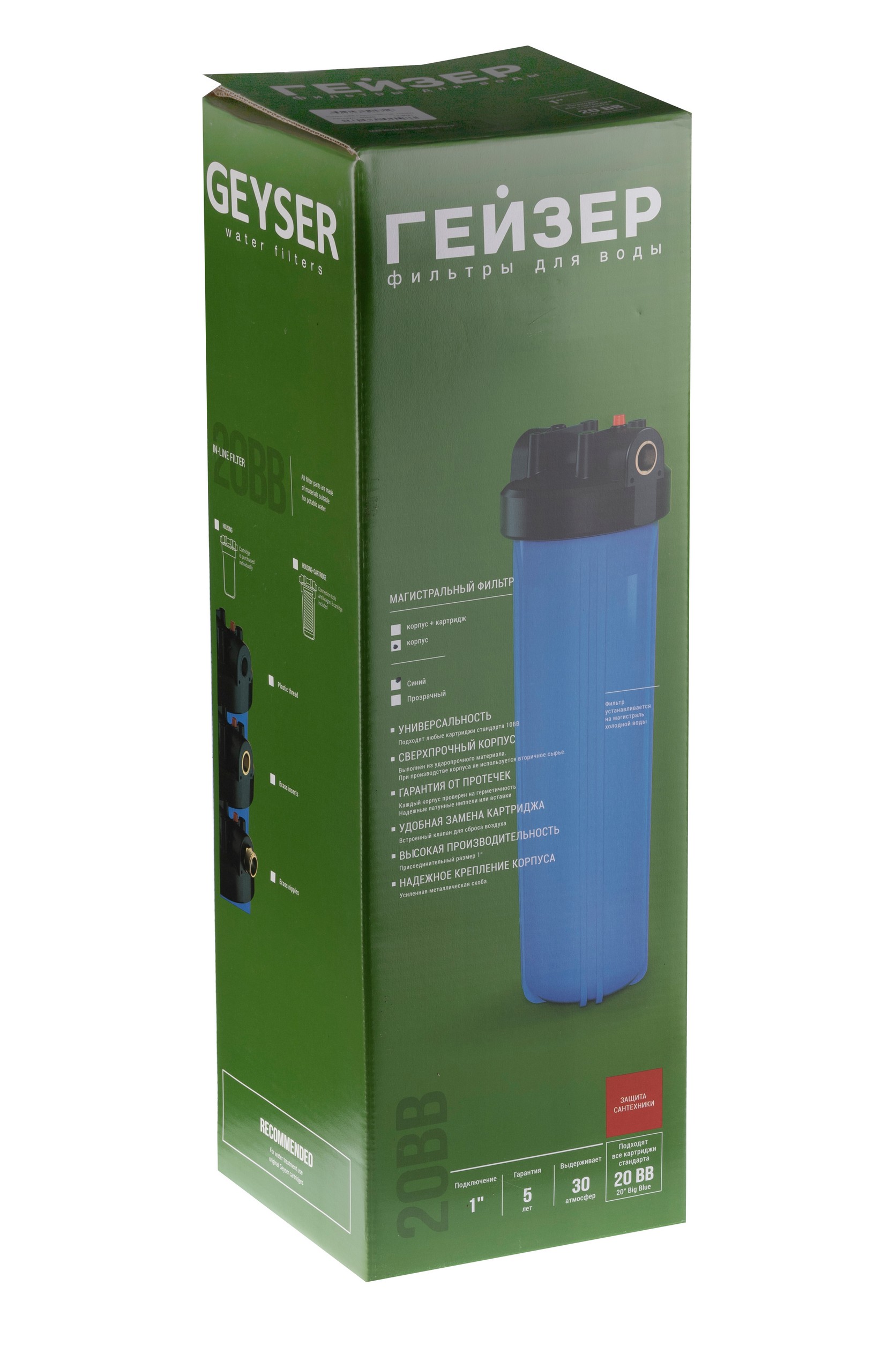 Корпус Гейзер 20BB изготовлен из синего полипропилена; крышка корпуса – черный полипропилен в комплекте с латунными ниппелями. Корпус рассчитан на работу под давлением и установку на входе в систему холодного водоснабжения. В производстве корпусов используется только первичное сырье пищевого класса.
