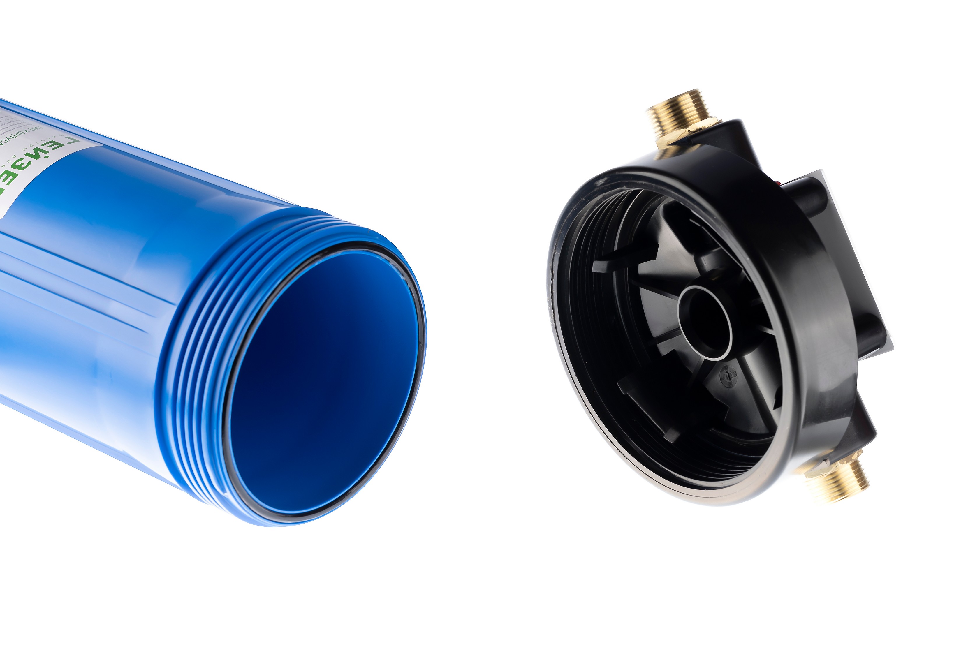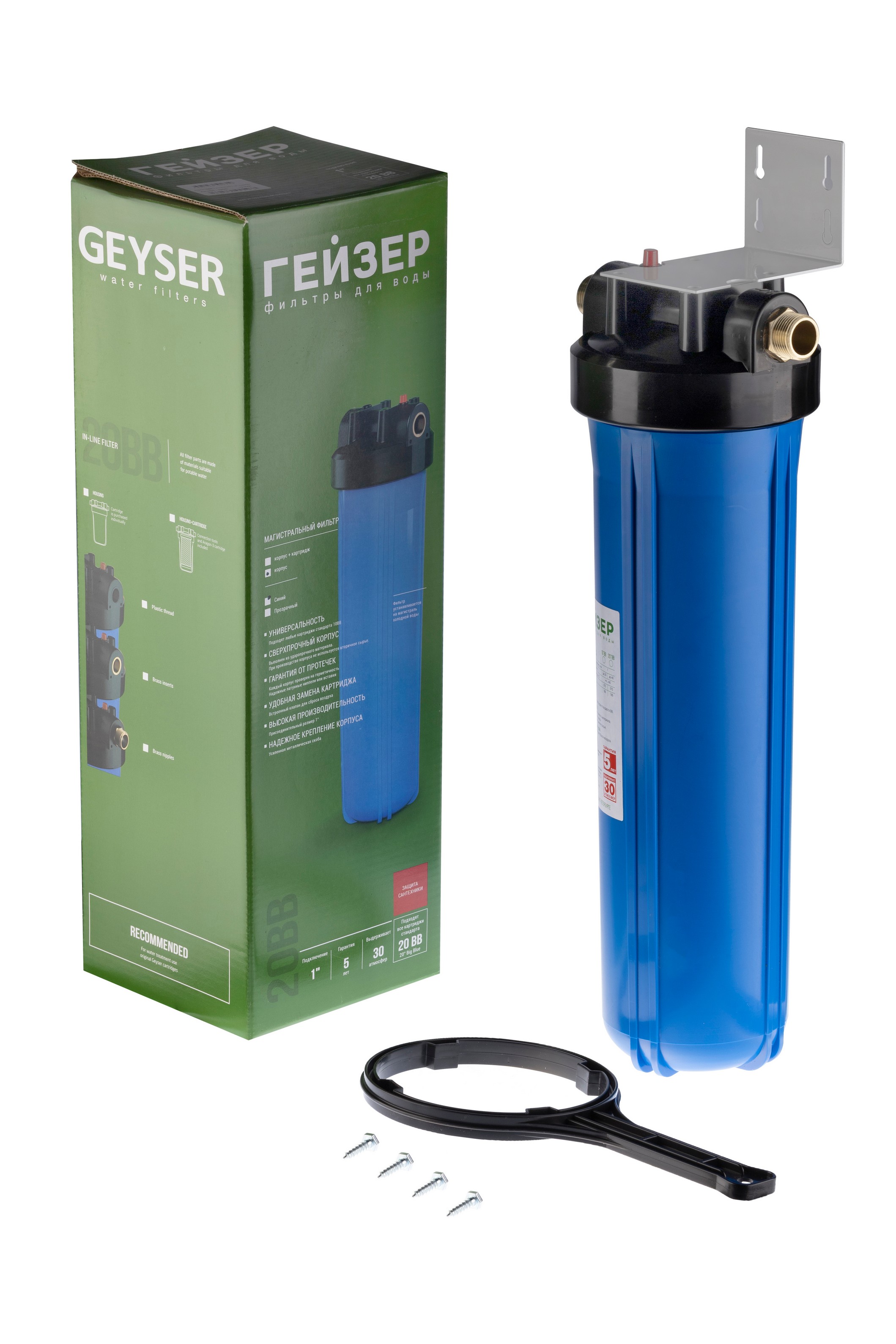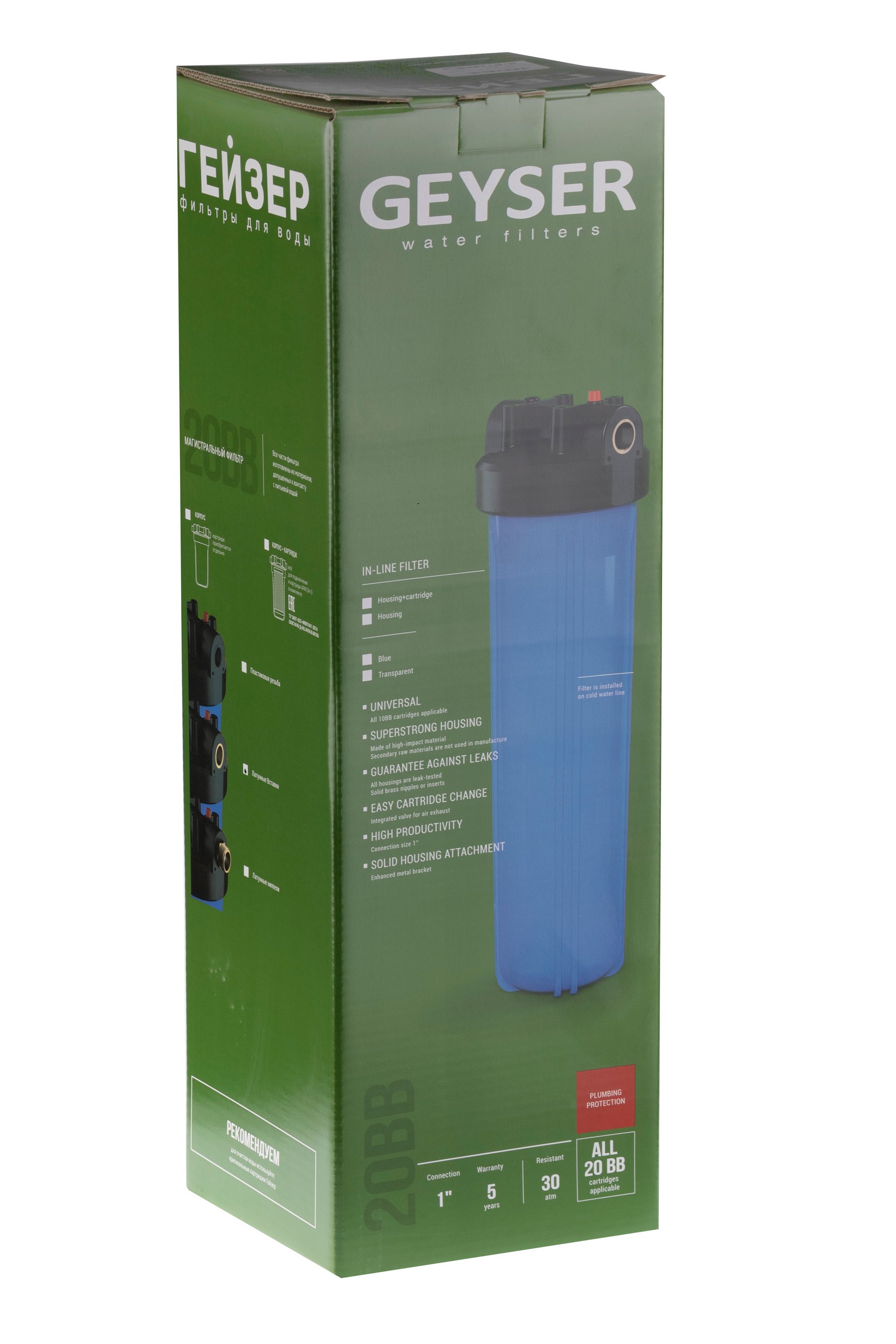 Корпус Гейзер 20BB изготовлен из синего полипропилена; крышка корпуса – черный полипропилен в комплекте с латунными ниппелями. Корпус рассчитан на работу под давлением и установку на входе в систему холодного водоснабжения. В производстве корпусов используется только первичное сырье пищевого класса.