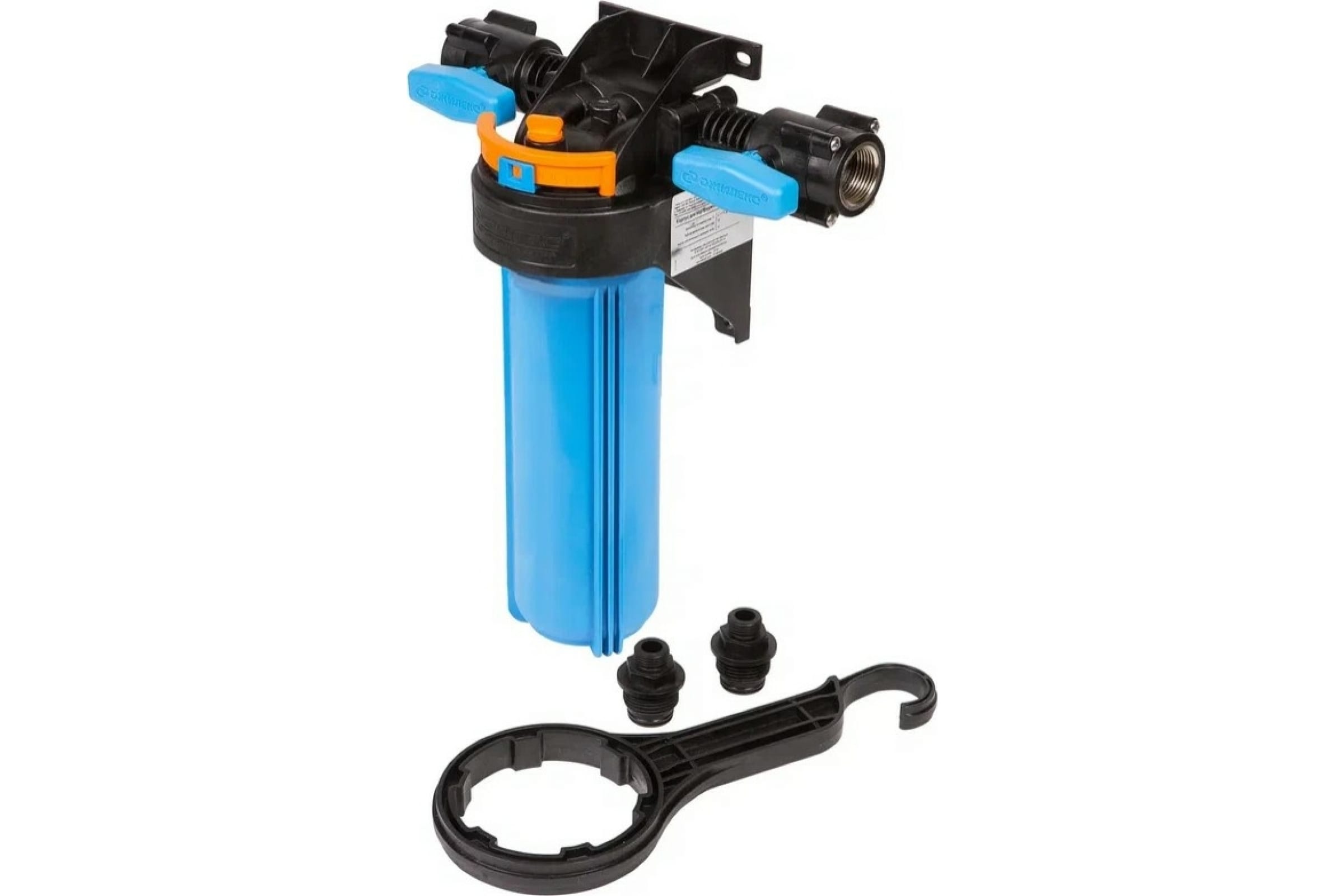 Комплектация: Колба, крышка, уплотнительное кольцо, накидная гайка, кронштейн, винты, ключ, шкала с ползунком, пробка (заглушка), проставка из полипропилена, коллектор корпуса фильтра, шаровой кран, инструкция по эксплуатации, гарантийный талон, тара упаковочная, штуцер переходной.