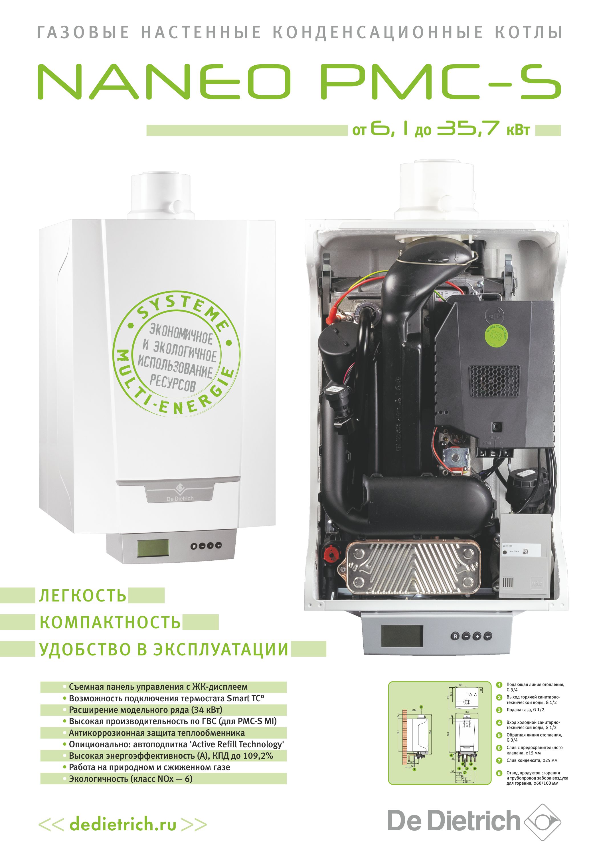 Бытовые газовые конденсационные котлы De Dietrich серии NANEO PMC-S используются для отопления и ГВС квартир в многоквартирных домах или загородных домов.