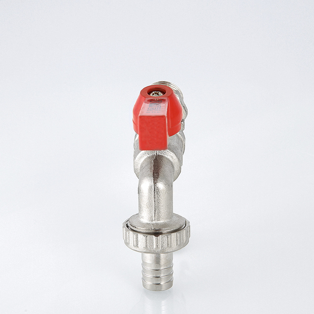 Латунный никелированный кран, применяемый в качестве запорной арматуры на трубопроводах систем водоснабжения (в том числе питьевого) с рабочей температурой до 75 °С при номинальном давлении 16 бар. Наличие съемного штуцера с накидной гайкой дает возможность производить его замену в зависимости от диаметра и материала применяемого шланга. Рассекатель обеспечивает формирование компактной струи на изливе. Кран оснащен алюминиевой рукояткой флажкового типа. Резьба присоединения – наружная. Неремонтопригодный. Средний полный ресурс – 8 тыс. циклов.