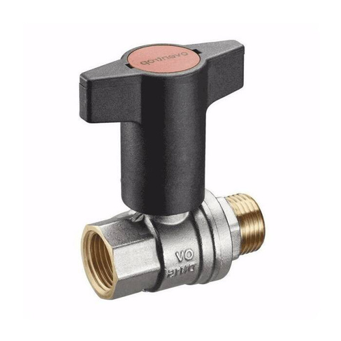 OVENTROP-Optibal шаровой кран, полнопроходной, из латуни, никелированный,шарик латунный, хромированный, уплотнение шарика из PTFE, уплотнительное кольцо-Viton, PN 20 для холодной воды, PN 16 для среды до 100 C,маховик пластмассовый, удлиненный. С одной стороны внутренняя резьба, с другой наружная резьба.