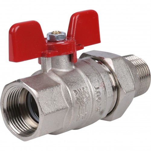 Stout кран шаровой полнопроходной с ""американкой"", ВР/НР, ручка бабочка 3/4 (EPDM) - это высококачественный кран, который обеспечивает надежный и удобный контроль потока жидкости. Оснащен шаровым механизмом, позволяющим полностью открывать или закрывать поток вещества, а также регулировать его интенсивность.