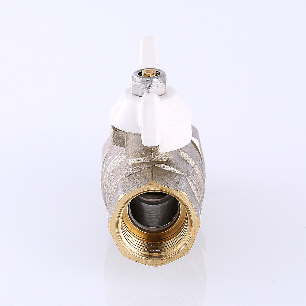 Прямой полнопроходной ремонтопригодный шаровой кран с увеличенным ресурсом. Соединен накидной гайкой с резьбовым полусгоном. Корпуса деталей – латунные, никелированные. Кран оснащен ручкой типа «бабочка» с утолщенной стенкой из алюминиевого сплава и эпоксидной покраской белого цвета. Полусгон укомплектован уплотнительным кольцом из эластомера EPDM. Резьба присоединений – внутренняя/наружная.