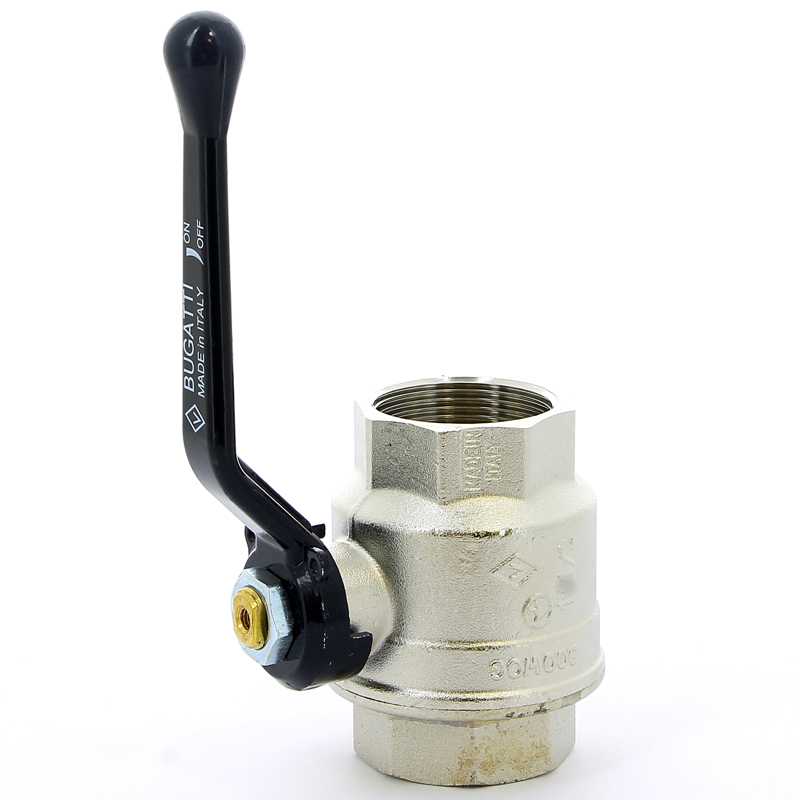 Кран шаровый BB Bugatti Oregon рычаг 1"1/2 усиленный применяется в качестве запорной арматуры в системах горячего и холодного водоснабжения, включая системы с питьевой водой, отопления, транспортировки сжатого воздуха и углеводородов, нефтепродуктов, на технологических трубопроводах, транспортирующих жидкости и газы, не агрессивных к материалам крана. Относится к запорной арматуре и не предназначен для регулирования потока. Шаровые краны Oregon выполнены из горячепрессованной никелированной латуни CW617N. Шар выполняется из кованной полированной хромированной латуни, уплотнение шара – Virgin PTFE, шток – латунь, уплотнения штока – PTFE и PFM. Для присоединения к трубопроводу применяется внутренняя резьба BB. Для перекрытия потока используется ручка-рычаг из алюминия с покрытием из эпоксидной эмали черного цвета.