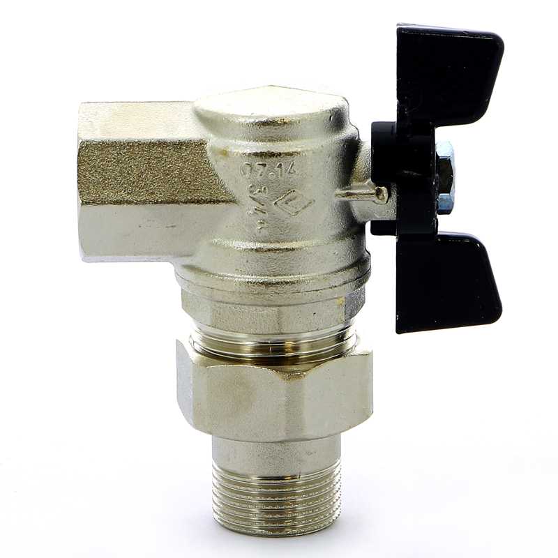 Кран шаровый HB угловой с разъемным соединением Bugatti Oregon бабочка 3/4" усиленный применяется в качестве запорной арматуры в системах горячего и холодного водоснабжения, включая системы с питьевой водой, отопления, транспортировки сжатого воздуха и углеводородов, нефтепродуктов, на технологических трубопроводах, транспортирующих жидкости и газы, не агрессивных к материалам крана. Относится к запорной арматуре и не предназначен для регулирования потока. Позволяет создавать быстроразъемные гидравлические конструкции. Соединение представляет собой съемный патрубок и накидную гайку. Шаровой кран со съемным патрубком может быть установлен перед конечными элементами трубопроводов систем водоснабжения и отопления, которые требуют периодических работ по обслуживанию, например, радиаторов отопления, котлов и прочее. Шаровые краны Oregon выполнены из горячепрессованной никелированной латуни CW617N. Шар выполняется из кованной полированной хромированной латуни, уплотнение шара – Virgin PTFE, шток – латунь, уплотнения штока – PTFE и PFM. Для присоединения к трубопроводу применяется наружная / внутренняя резьба HB.