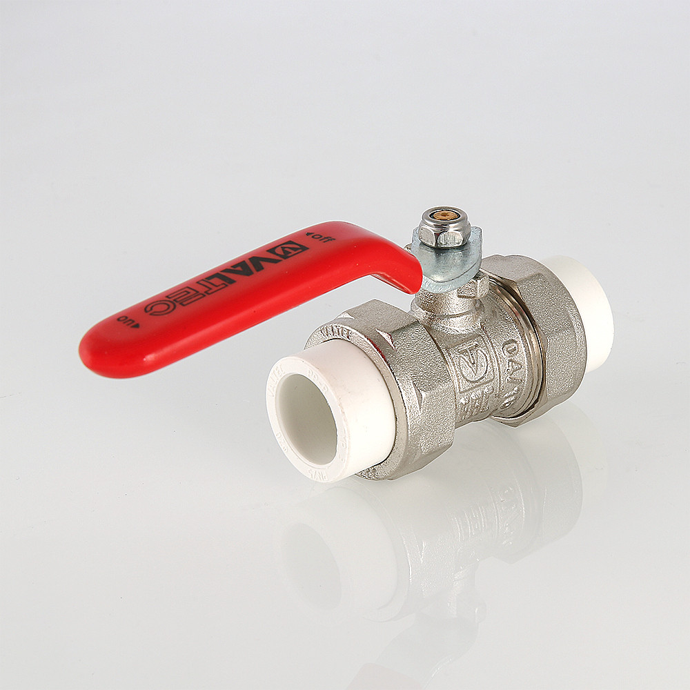 Переход крана на полипропиленовую трубу осуществляется с помощью накидных гаек, соединение с трубопроводом – раструбной сваркой. Рукоятка – флажковая, выполненная из оцинкованной стали с ПВХ-покрытием. Минимальный ресурс крана – 8 тыс. циклов. Максимальная рабочая температура – 90 °С, номинальное давление (PN) – 25 бар. По эффективному диаметру – полнопроходной.