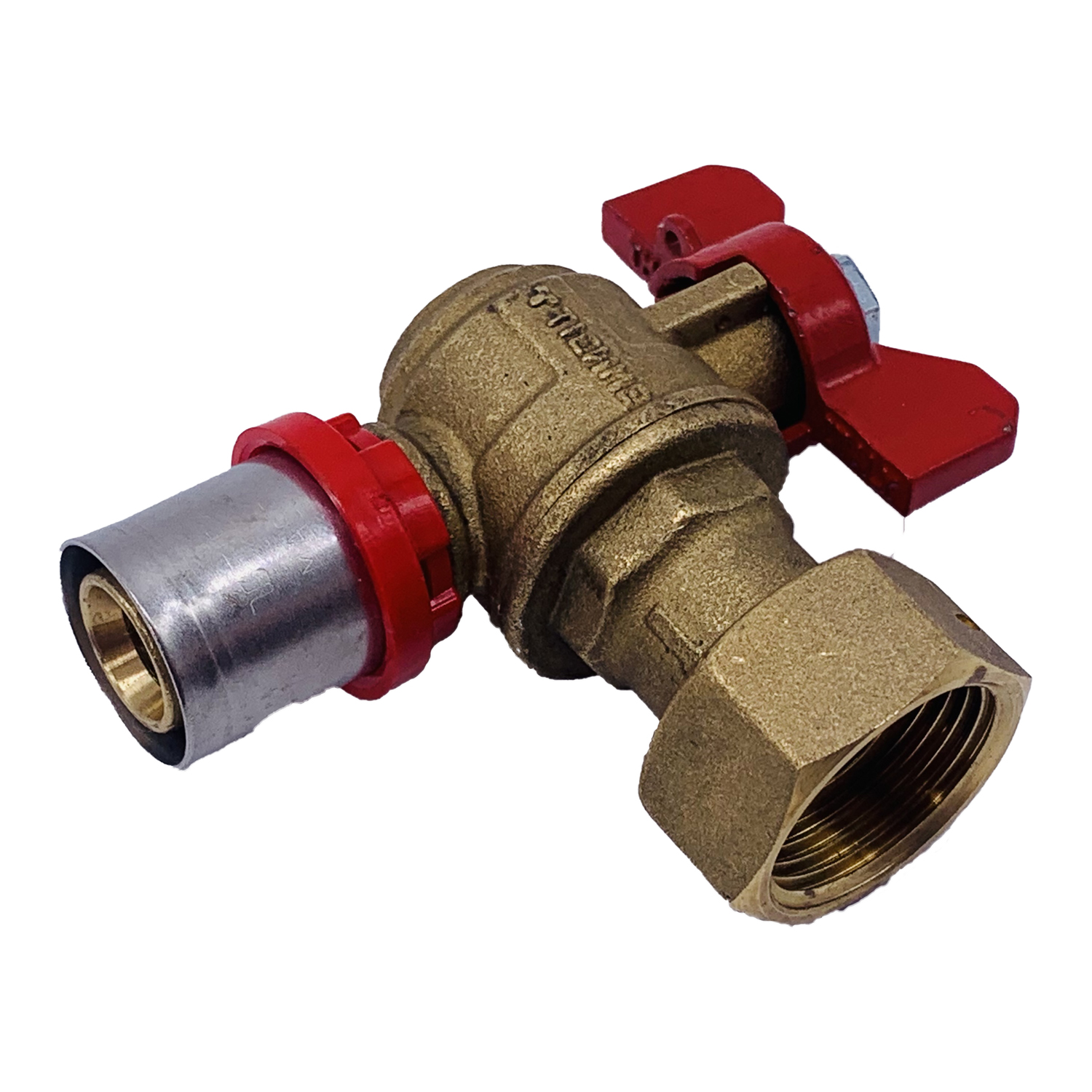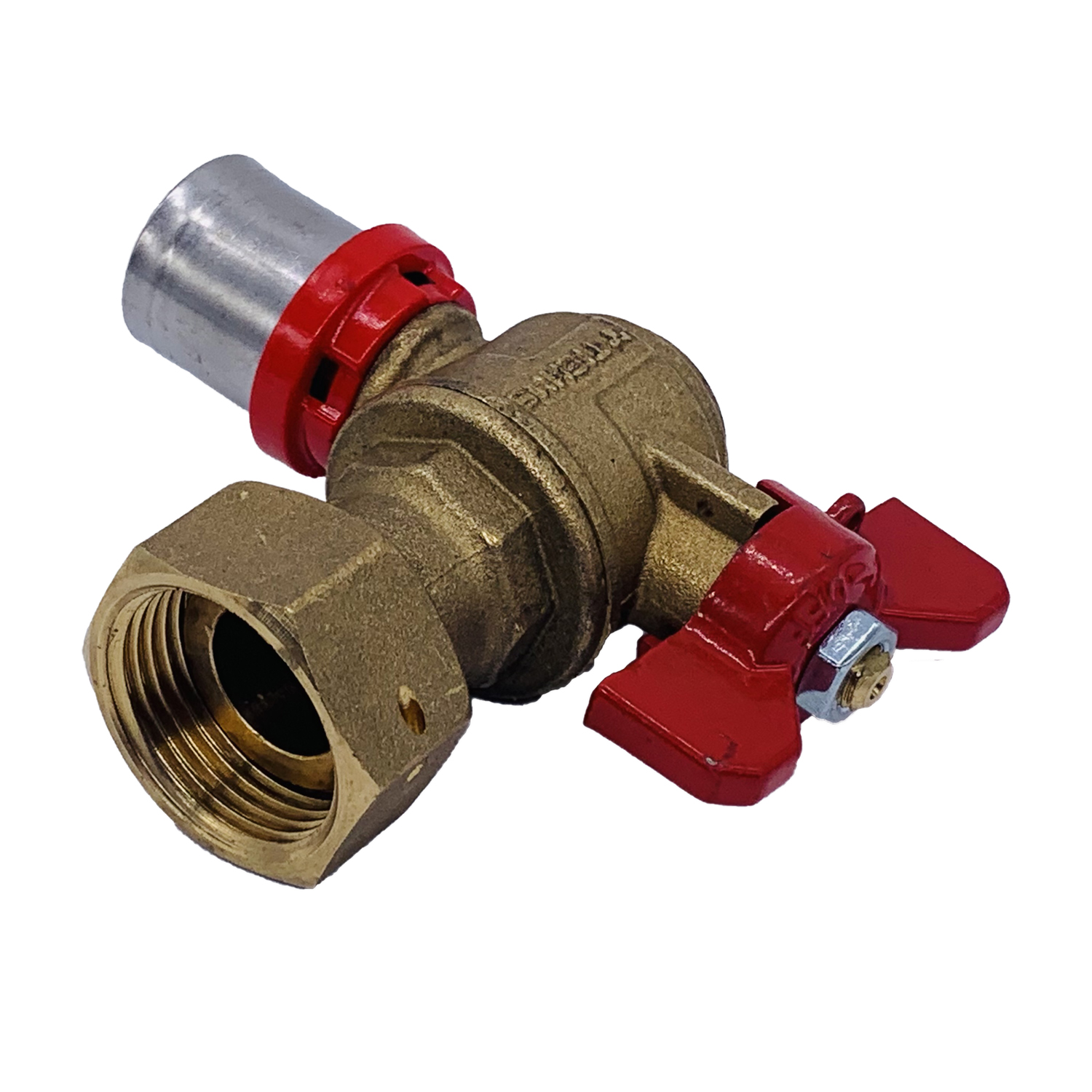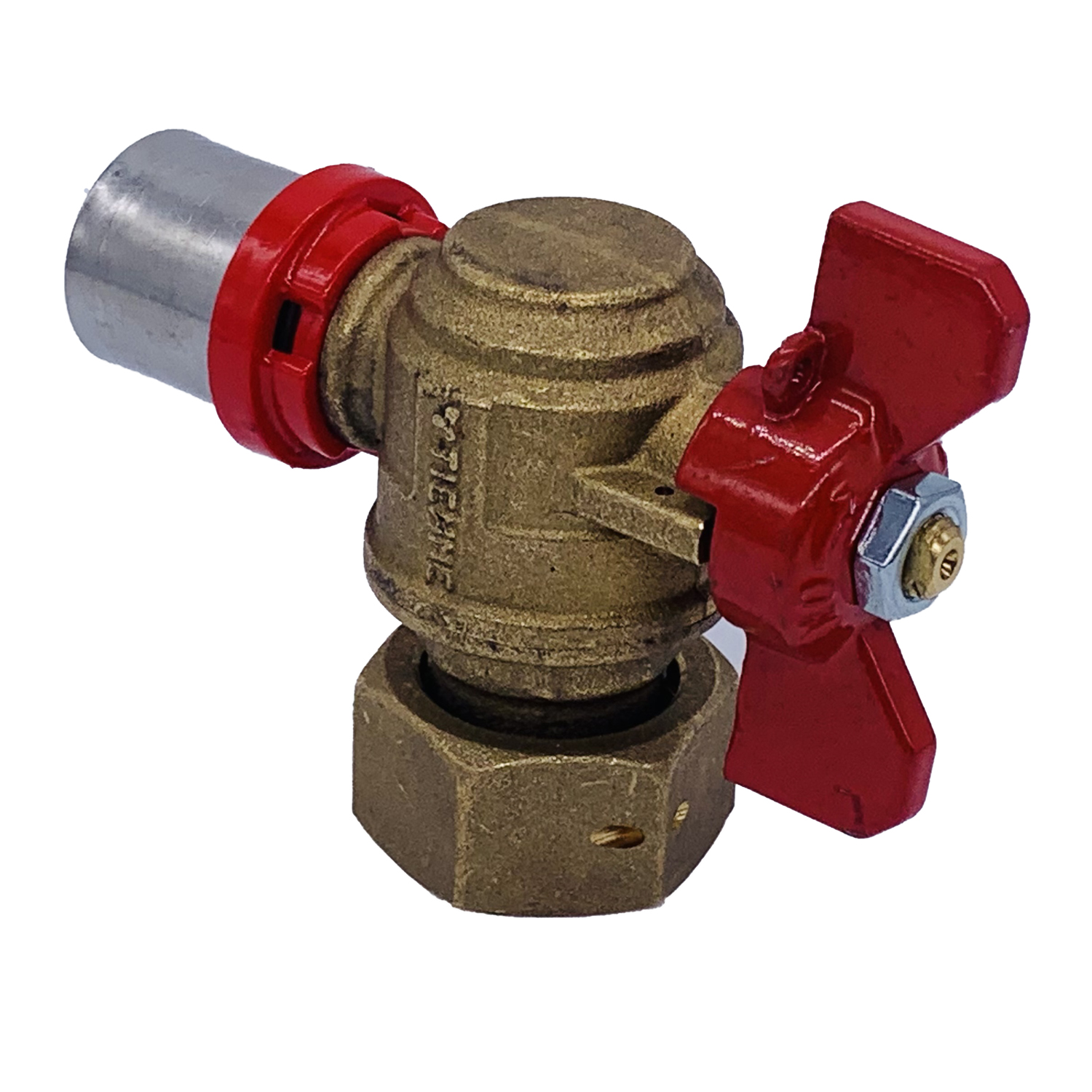 Кран шаровый угловой с накидной гайкой Tiemme 20*3/4"В пресс (латунь) (1680019) / Шаровой кран с ручкой-бабочкой, с концами под запрессовку для многослойной трубы и свободной гайкой (Art. 1692)