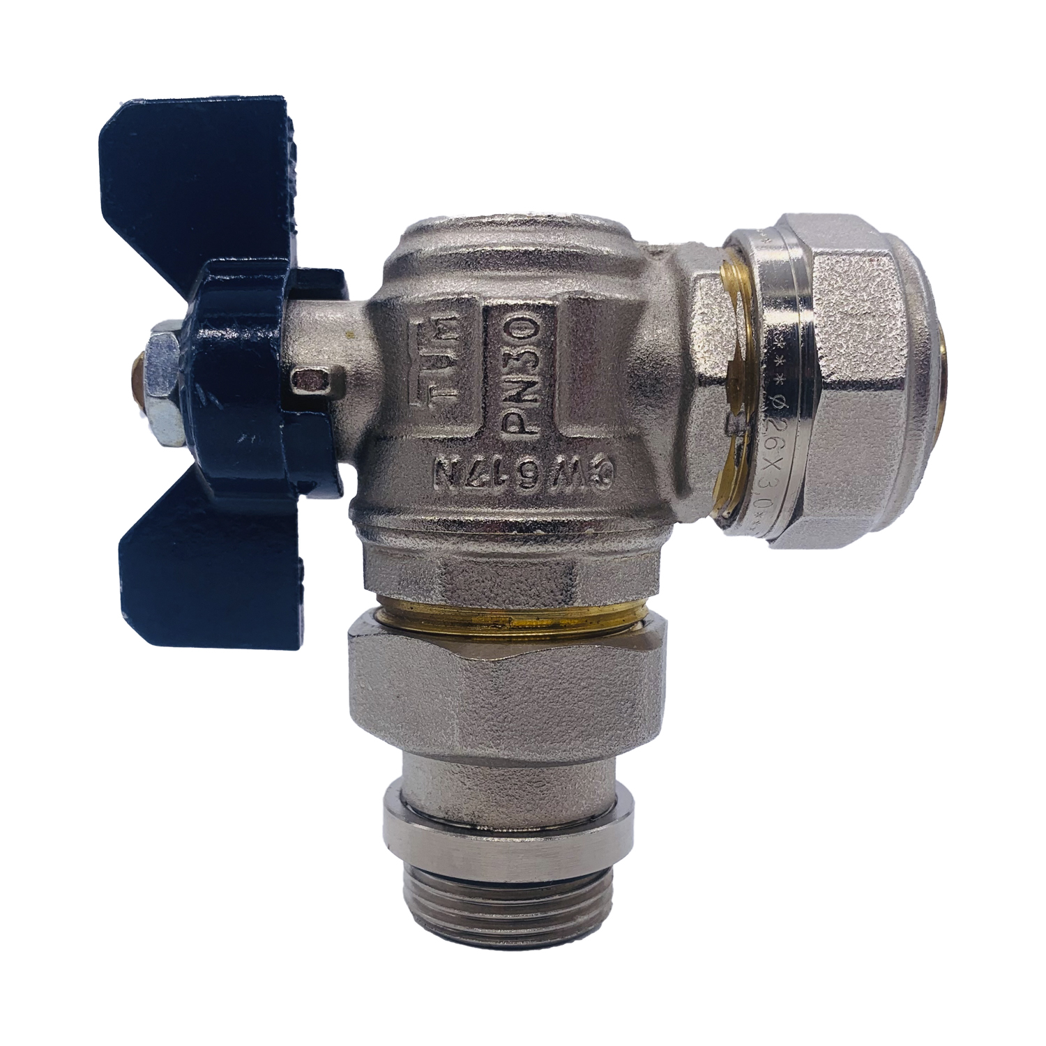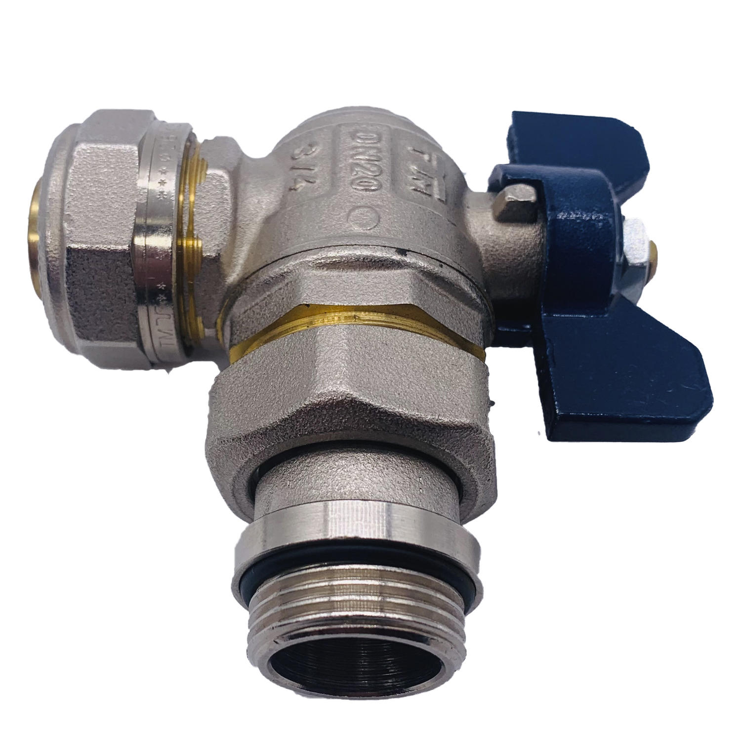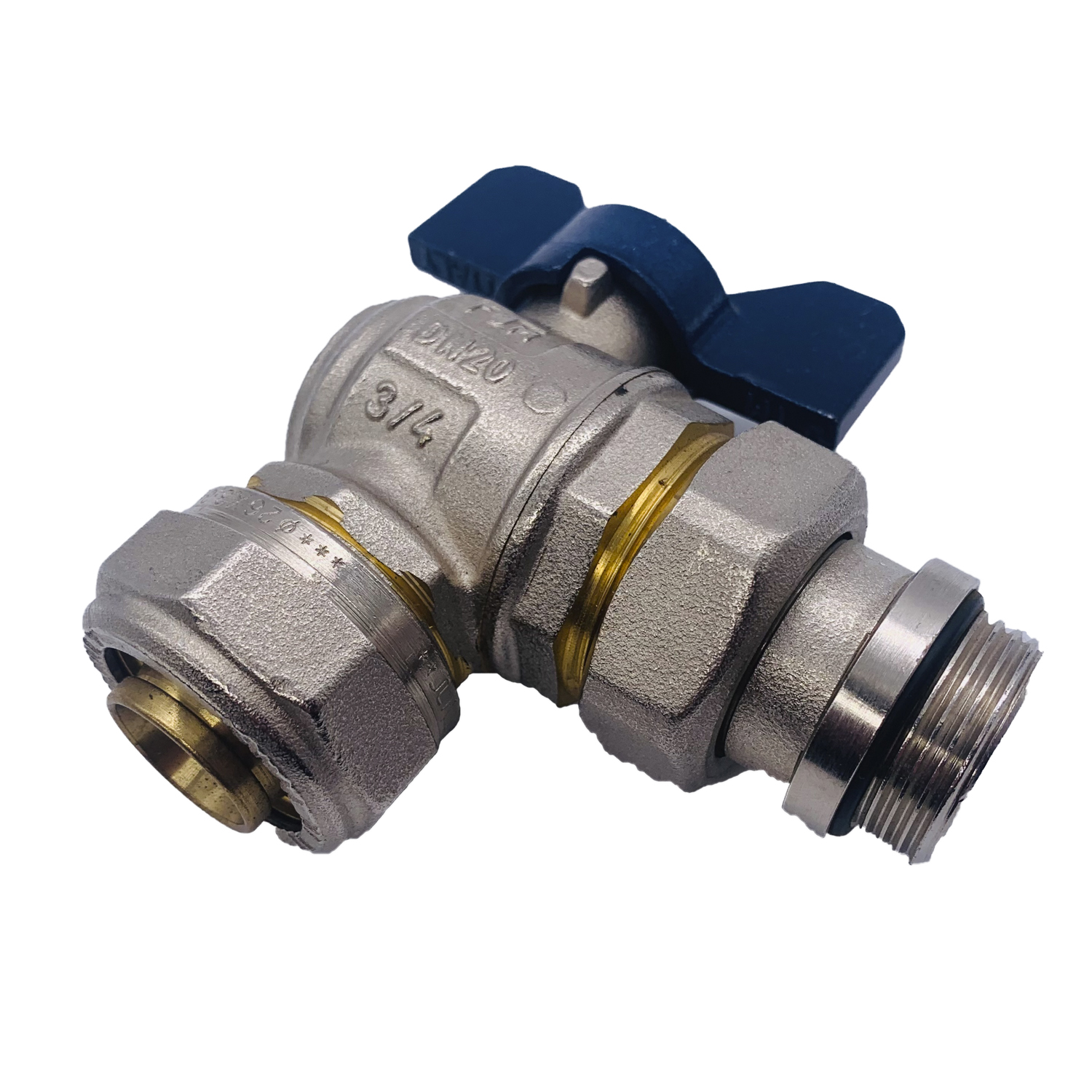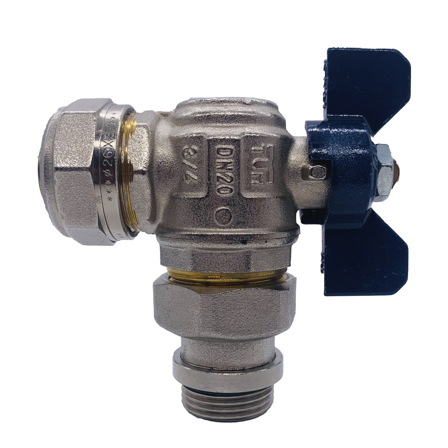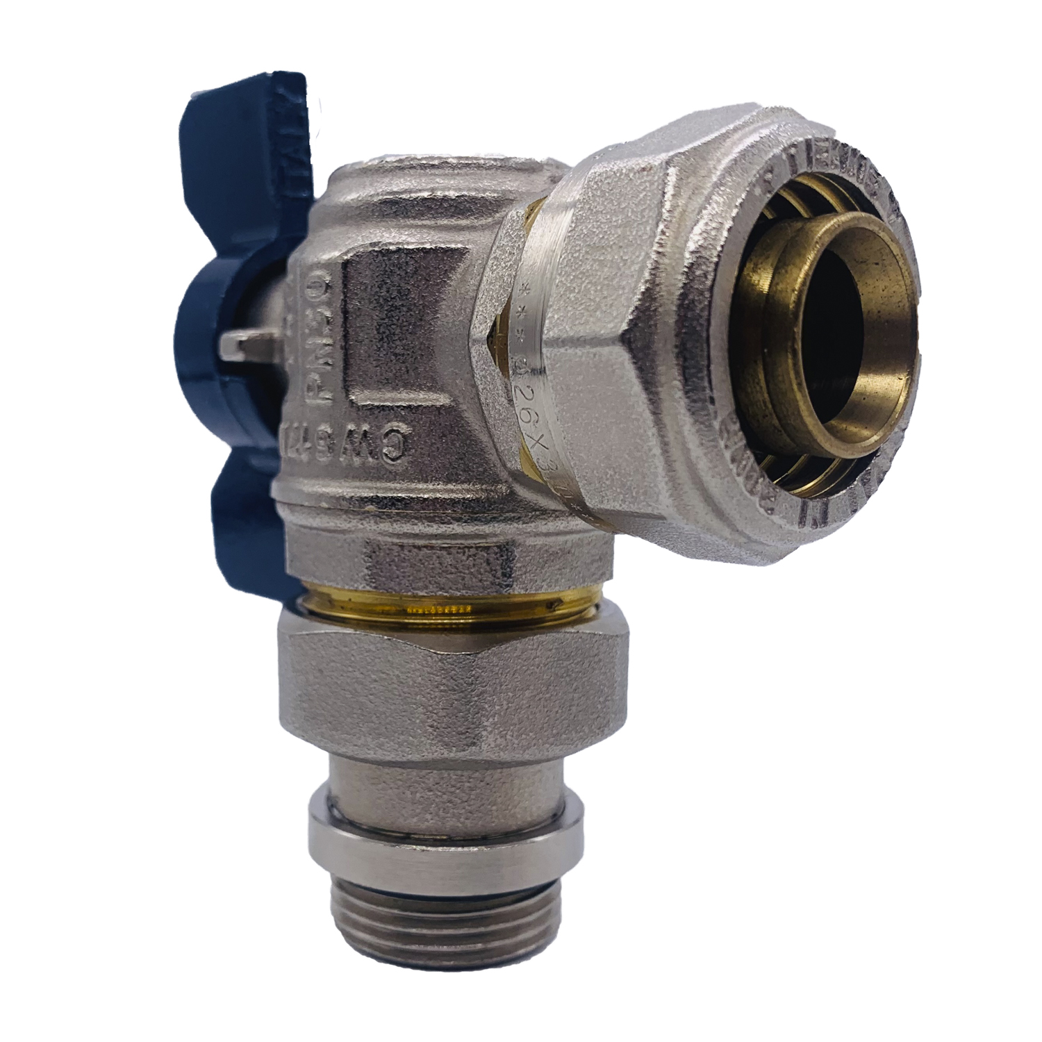 Кран угловой шаровый со сгоном Tiemme 26*3/4" (синяя бабочка) (1620004) / Шаровой кран, полнопроходной, угловой с ручкой-бабочкой красного или синего цвета с уплотнением и плоской прокладкой (Art. 2181CPR)