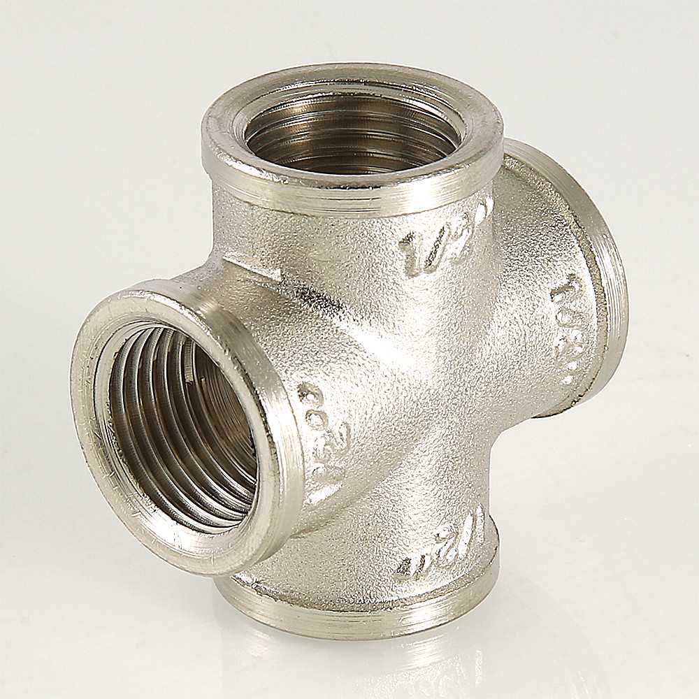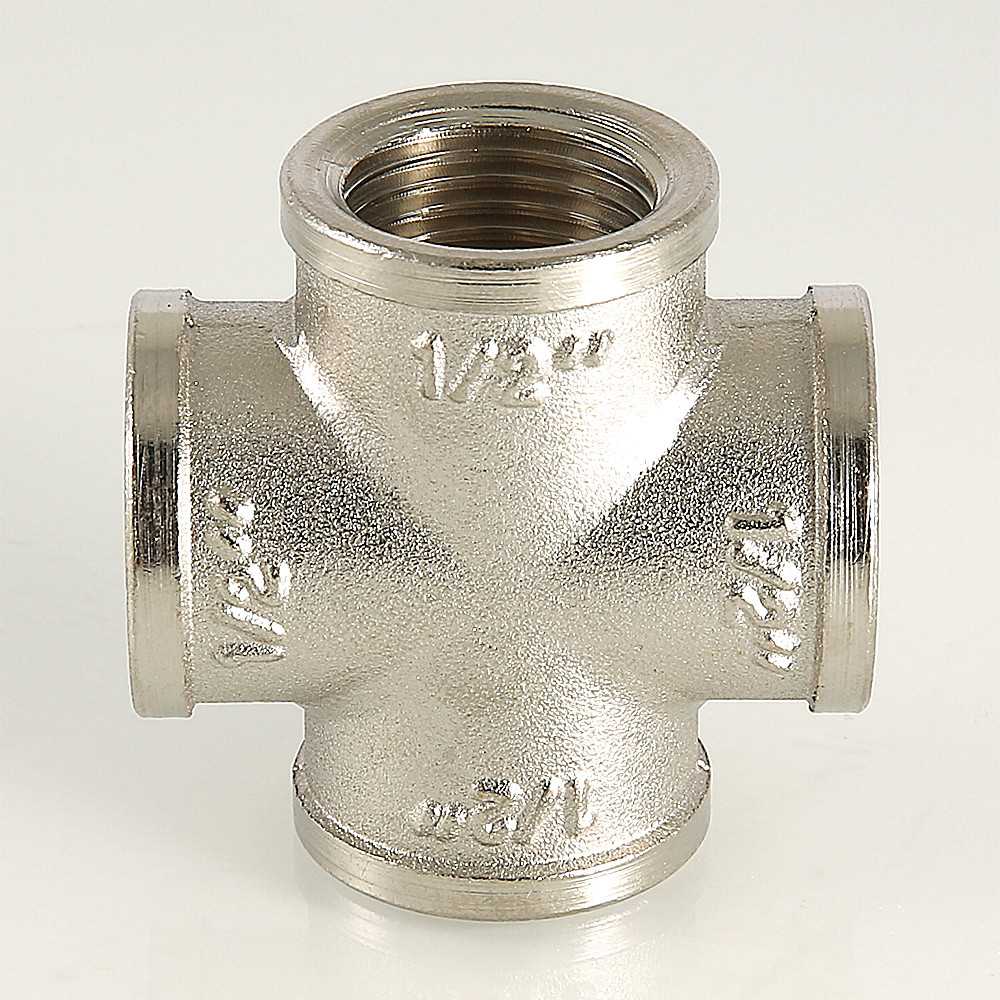 Латунный никелированный четырехсторонний фитинг, равнопроходной. Резьба – внутренняя, цилиндрическая трубная по ГОСТу 6357 (ISO 228, EN 10226), совместимая также с наружной конической трубной резьбой по ГОСТу 6211 (ISO R7).