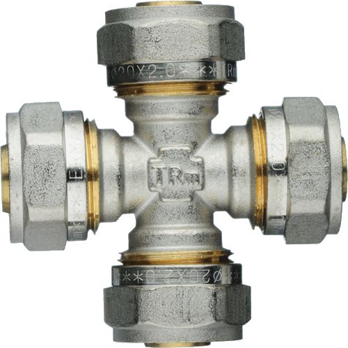 Крестовина латунная никелированная 20*20*20*20 цанга ТeRmaкрестовина для подключения до четырёх металлопластиковых труб с диаметром 20 мм. Применяется при монтаже трубопроводов водоснабжения, водяного отопления, технологических установок, транспортирующих газы и жидкости, неагрессивные к материалам труб и соединений.