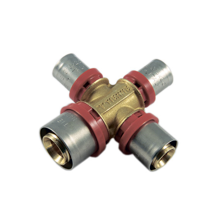 Крестовина представляет собой неразъемное соединение (т.е. не подлежащее разборке) с отводами под опрессовку с четырех сторон, расположенных под углом 90 градусов друг к другу. Применяется для быстрого и качественного соединения металлопластиковых при монтаже систем холодного и горячего водоснабжения, систем отопления, сантехнического оборудования.