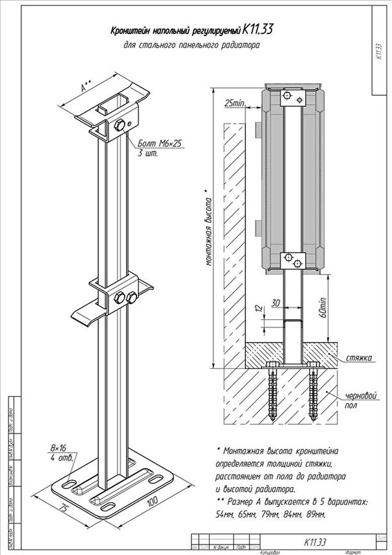 Кронштейн напольный предназначен для крепления стальных панельных радиаторов на пол.