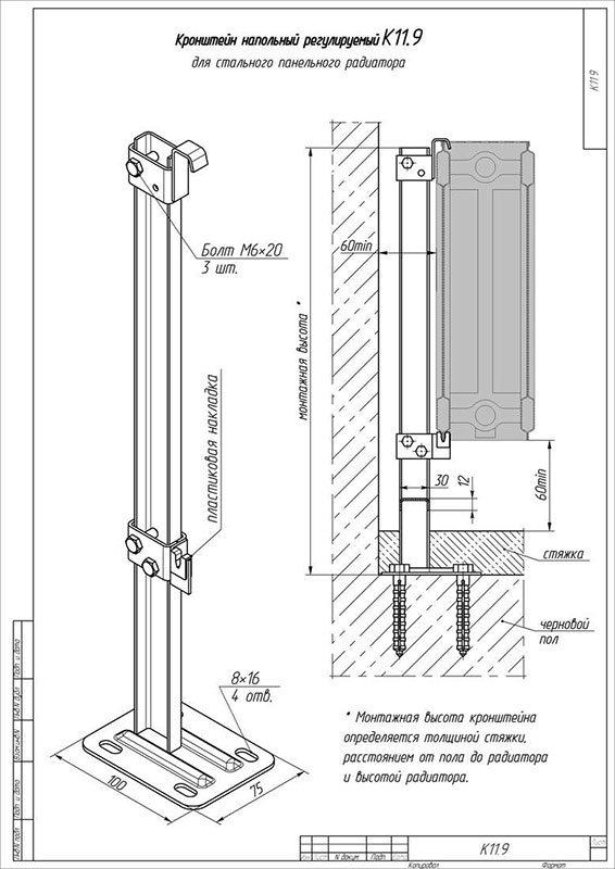 Кронштейн напольный К11.9 Buderus предназначен для крепления стальных панельных радиаторов на пол. Для наружного монтажа.
