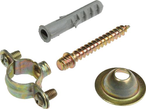 Хомут оцинкованная сталь, без резинового уплотнителя в комплекте с шурупом, дюбелем, декоративной чашкой. Трубный хомут без резиновой прокладки применяется для монтажа труб водоснабжения, отопления и газоснабжения во всех видах инженерных коммуникаций, в комплекте с шурупом, дюбелем, декоративной чашкой, быстрый легкий монтаж и демонтаж, можно увеличить отступ от стены используя удлинитель шпильки