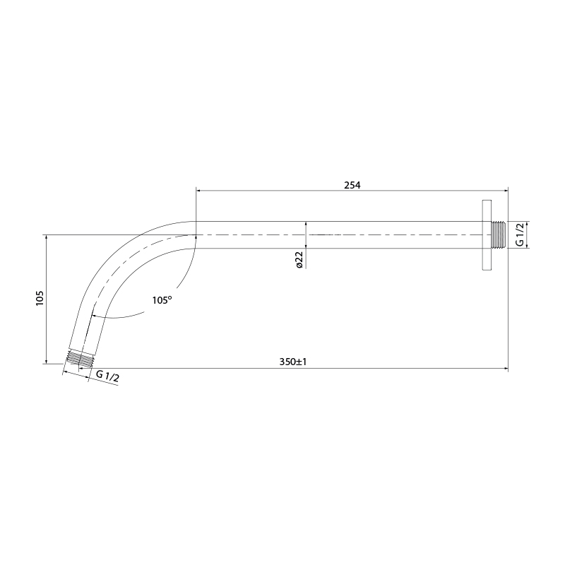 Кронштейн для верхнего душа, материал латунь, цвет хром, никель-хромовое покрытие, длина 350 мм, внутренний диаметр 22мм, толщина изделия 0,8 мм.