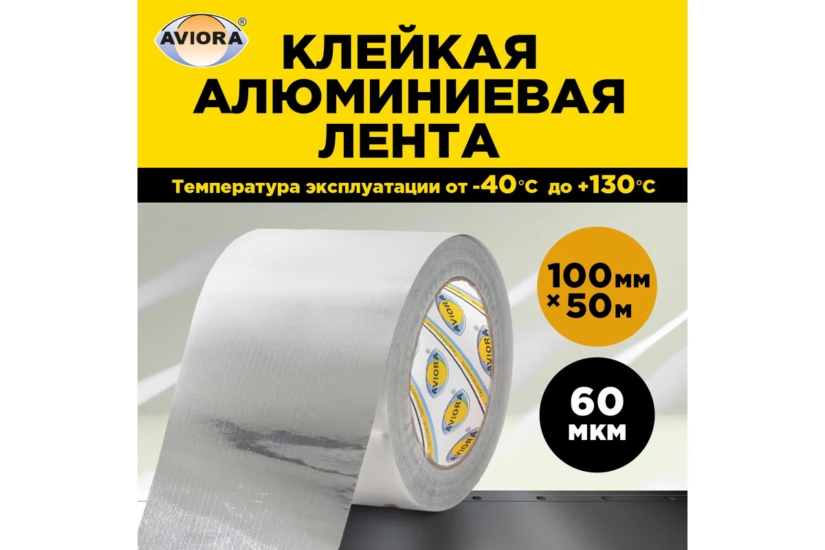 Алюминиевая клейкая лента AVIORA состоит из 3 слоев общей толщиной 60 мкм: фольга (30 мкм), акриловый клей на основе растворителей и силиконизированная бумага. Толщина силиконизированной бумаги позволяет разматывать ленту без разрывов.