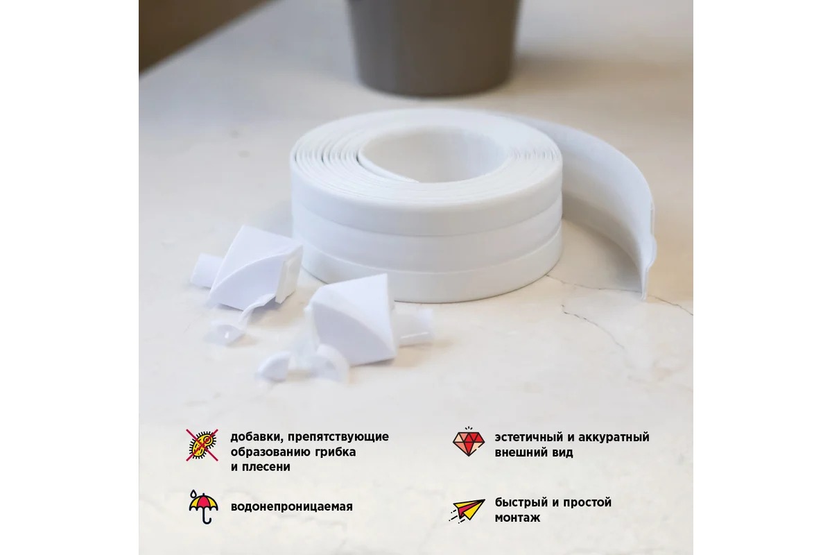 Бордюрная фигурная лента для ванн и раковин AVIORA 38 мм, 3,35 м, клейкая 302-104 является прочным, простым и надежным приспособлением для герметизации швов в ванной комнате и на кухне. Кроме того, лента позволяет красиво оформить углы. Изделие состоит из каучуковой основы и нанесенного на нее клеевого слоя.