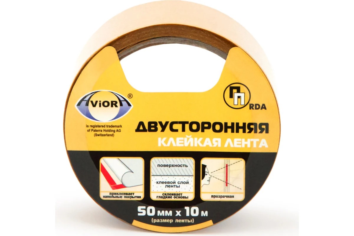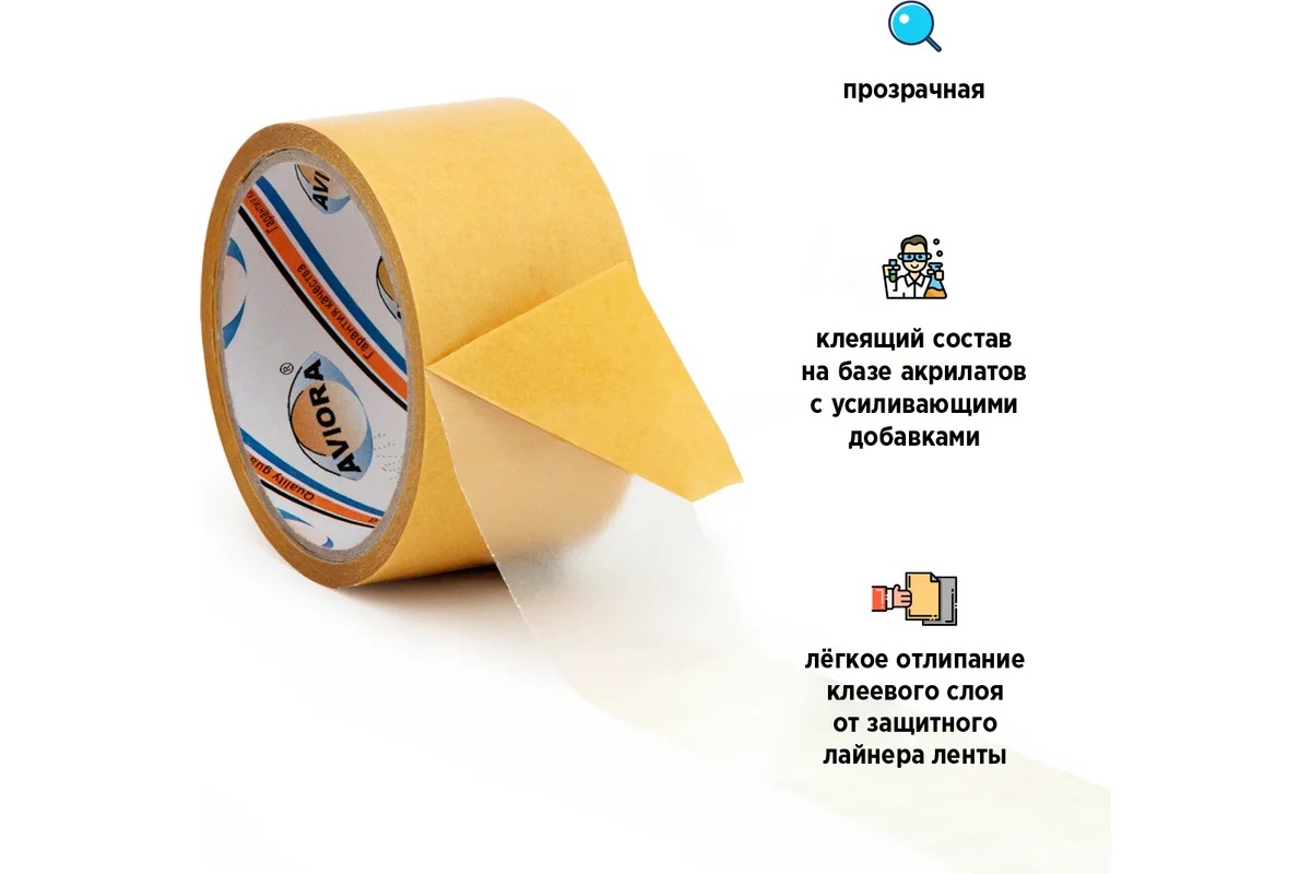 Двусторонняя прозрачная клейкая лента на ПП основе AVIORA 50 мм, 10 м 303-005 на базе акрилатов с использованием специальных усиливающих добавок обеспечивает надежное крепление к гладкой поверхности. Предназначена для фиксации гладких напольных покрытий, крепежа плакатов, фотографий, постеров и прочих декоративных элементов, соединения прозрачных материалов (например, крепление градусников или информационных листов к стеклу, соединения прозрачного оргстекла), упаковки (например: подарочной).