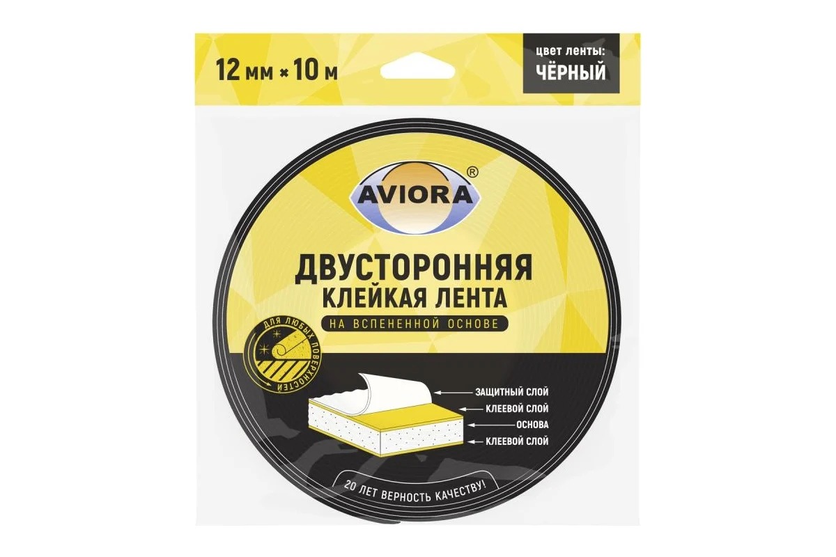 Двусторонняя клейкая лента AVIORA предназначена для прочного крепления предметов на вертикальные поверхности: молдинги, плинтусы, пластиковые бордюры, для монтажа и соединения конструкций из различных материалов. Двусторонний скотч также подходит для различных типов поверхностей (кафель, дерево, пластик, металл, бетон и т.д.). Основа двустороннего скотча изготовлена из вспененного ЭВА (этилвинилацетат), а клейкий слой - это клей hot-melt (хот мелт). Благодаря тому, что основа ленты имеет значительную толщину и специализированный клеевой слой, отличающийся очень высокой степенью адгезии, лента обладает повышенной мягкостью и гибкостью (по сравнению с аналогичными), обеспечивает быстрое и удобное соединение различных материалов. Лента заполняет все неровности, тем самым увеличивая площадь и качество сцепления.