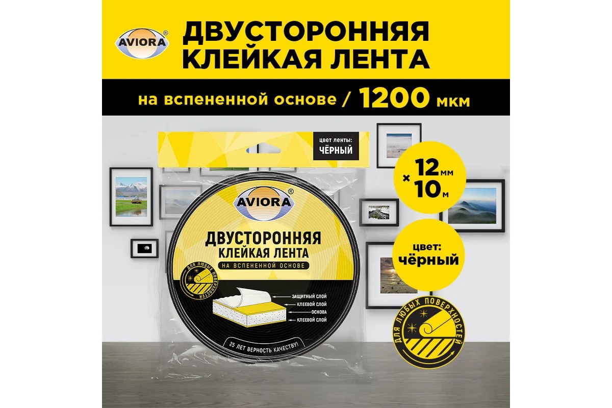 Лента клейкая двусторонняя на вспененной основе Aviora 12 мм х 10 м (черная) (302-012)