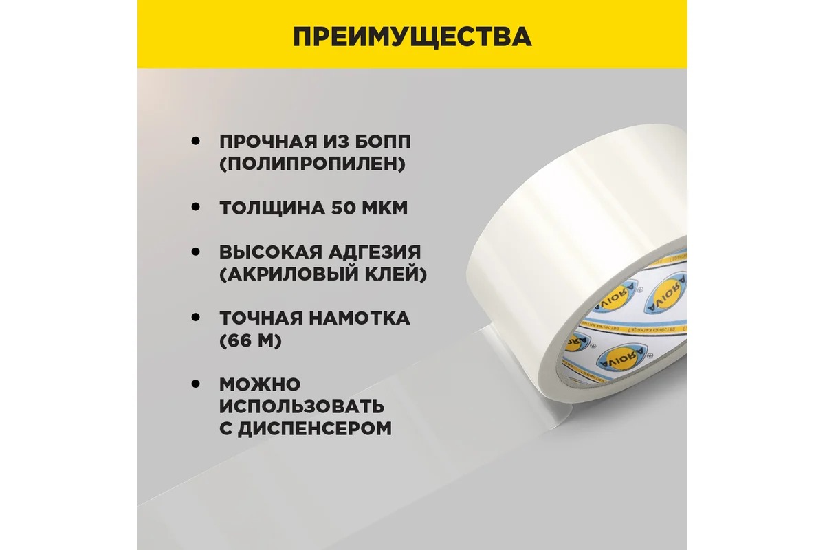 Основа упаковочного скотча Авиора сделана из БОПП (биаксиально-ориентированный полипропилен), который обладает более прочными свойствами, чем обычный полипропилен.