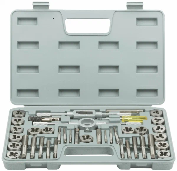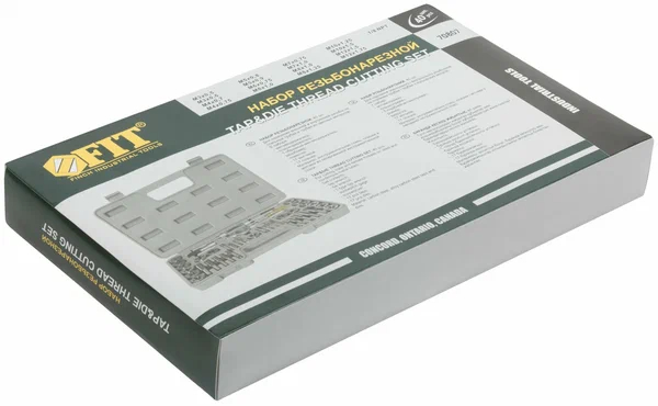 Подробная комплектация: В наборе: метчикодержатель, плашкодержатель, 9 метчиков и 9 плашек (М3 x 0,5, М4 x 0,7, М5 x 0,8, М6 x 1,0, М7 x 1,0, М8 x 1,25, М10 x 1,5, М12 x 1,75, 1/8NPT). Материал: легированная инструментальная сталь. Упаковка: пластиковый чемодан.
